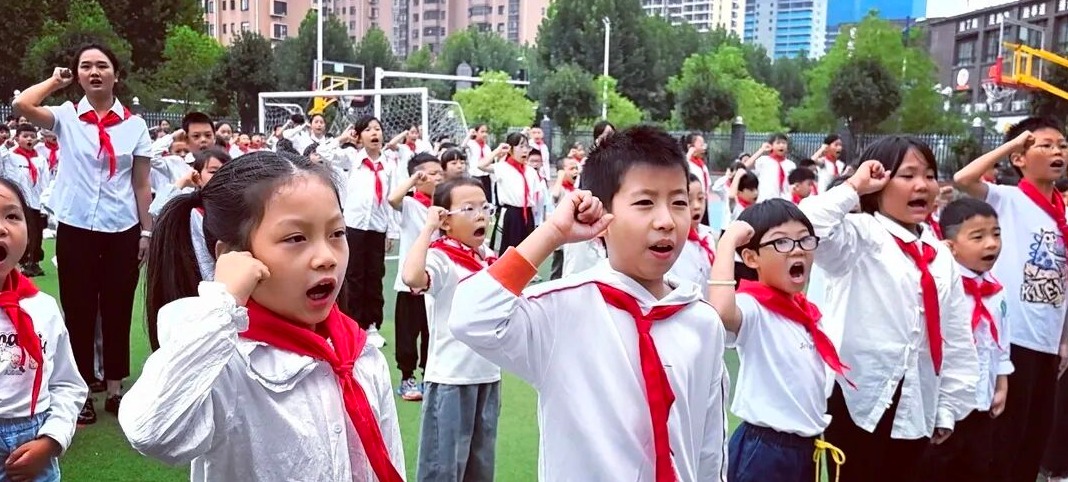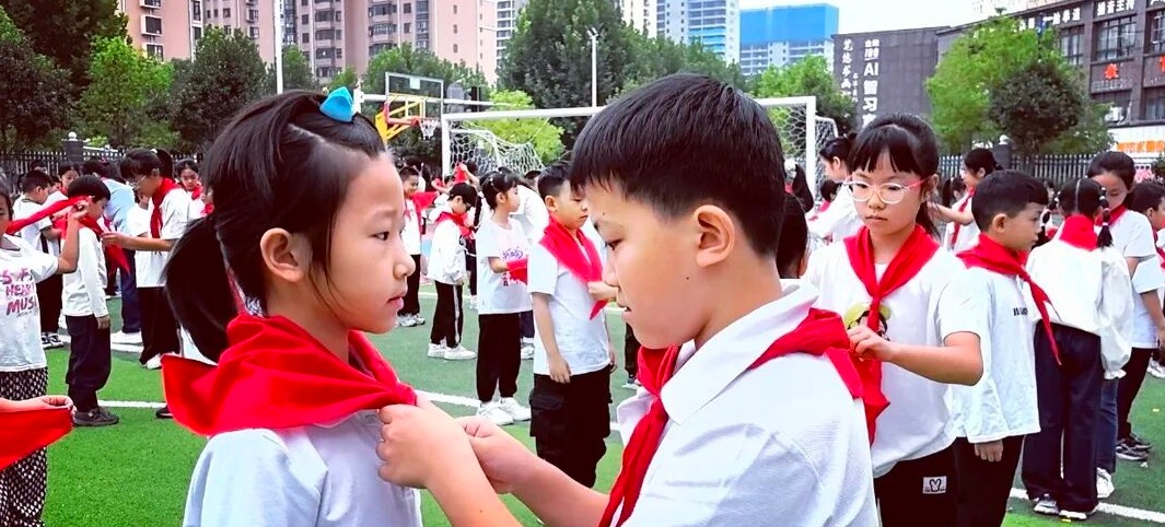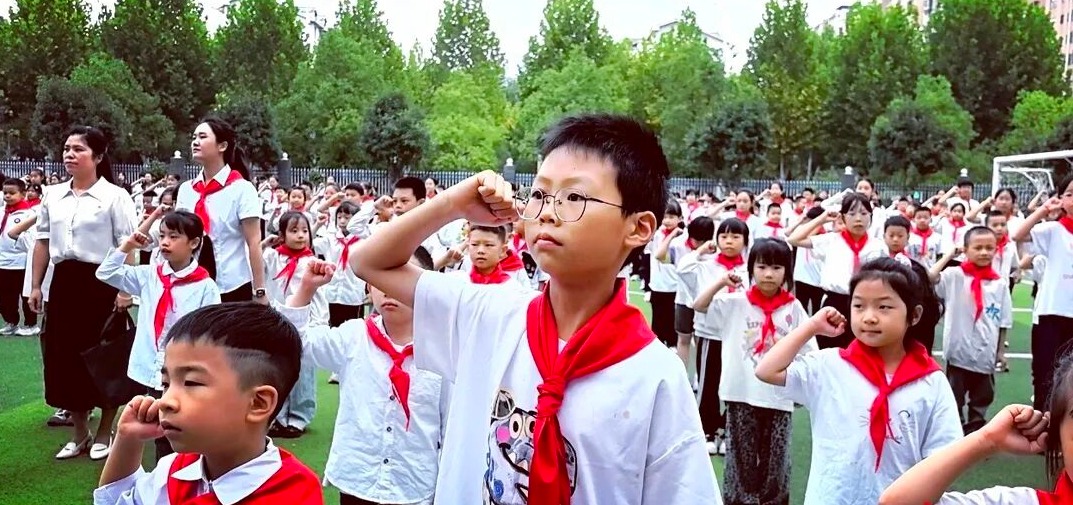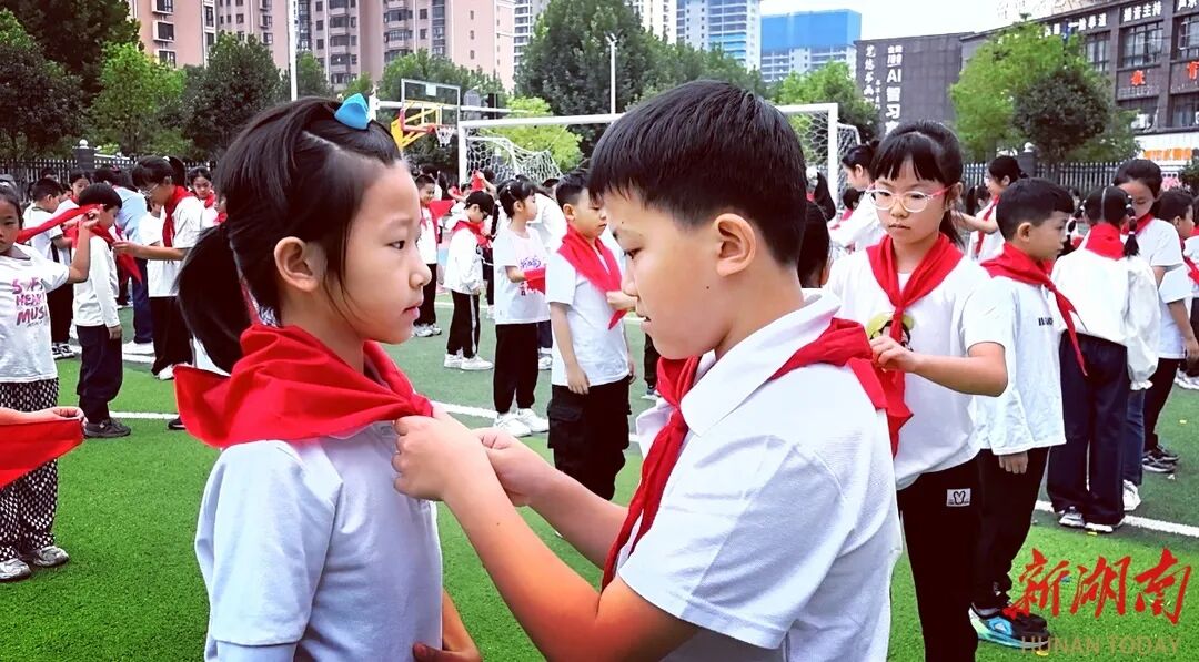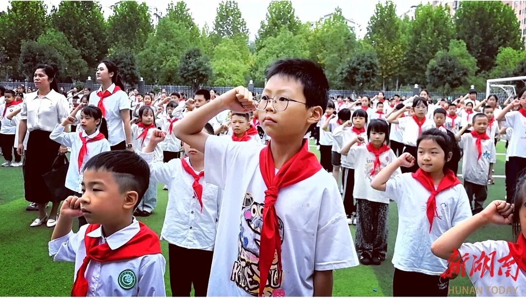 紧接着,大祥区华夏方圆学校相关负责人宣读《关于2025年“建队日”批准新队员入队的决定》。出席活动的领导嘉宾与老队员们一起为新队员佩戴上鲜艳的红领巾。在国旗下、队旗旁,新队员们胸前的红领巾随风飘扬,他们眼神坚定,在该校大队辅导员的带领下,进行了铿锵有力的宣誓。
