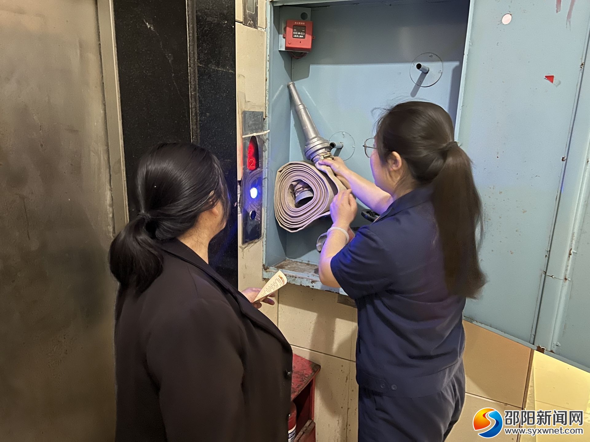 消防宣传员指导居民使用室内消火栓