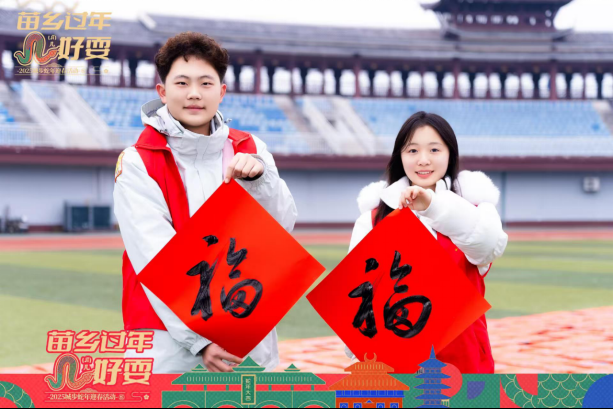 从高空俯瞰,绿茵场内,近万张福字组成了三个红彤彤、喜气洋洋的大方块,年味十足,前来领取春联的群众络绎不绝。“小小书法家”肖远博说:“手写的春联太有年味了,今天我在这里写了几个福字,在新的一年里希望自己有个好彩头,也祝大家好运连连。”