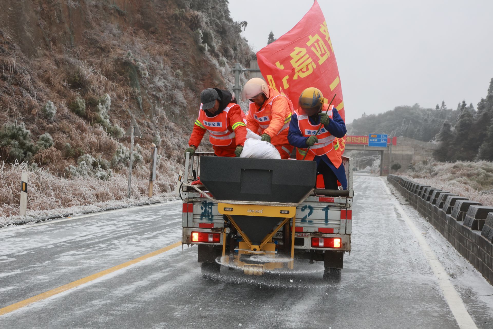 在省道S576线铺落水至江头司路段,县公路建设养护中心应急分队正组织人员加紧搬运融雪剂等物资,为新一轮除冰作业做准备。城步公路建设养护中心干线公路养护股易德章介绍,“我们凌晨就已经在这里值班值守了,刚撒完融雪剂的路面不到两小时又结冰了,但这条路是南山奶牛基地一万多头奶牛的口粮通道,也是湘桂边界好几个乡镇的生命线,再冷也得守住。”