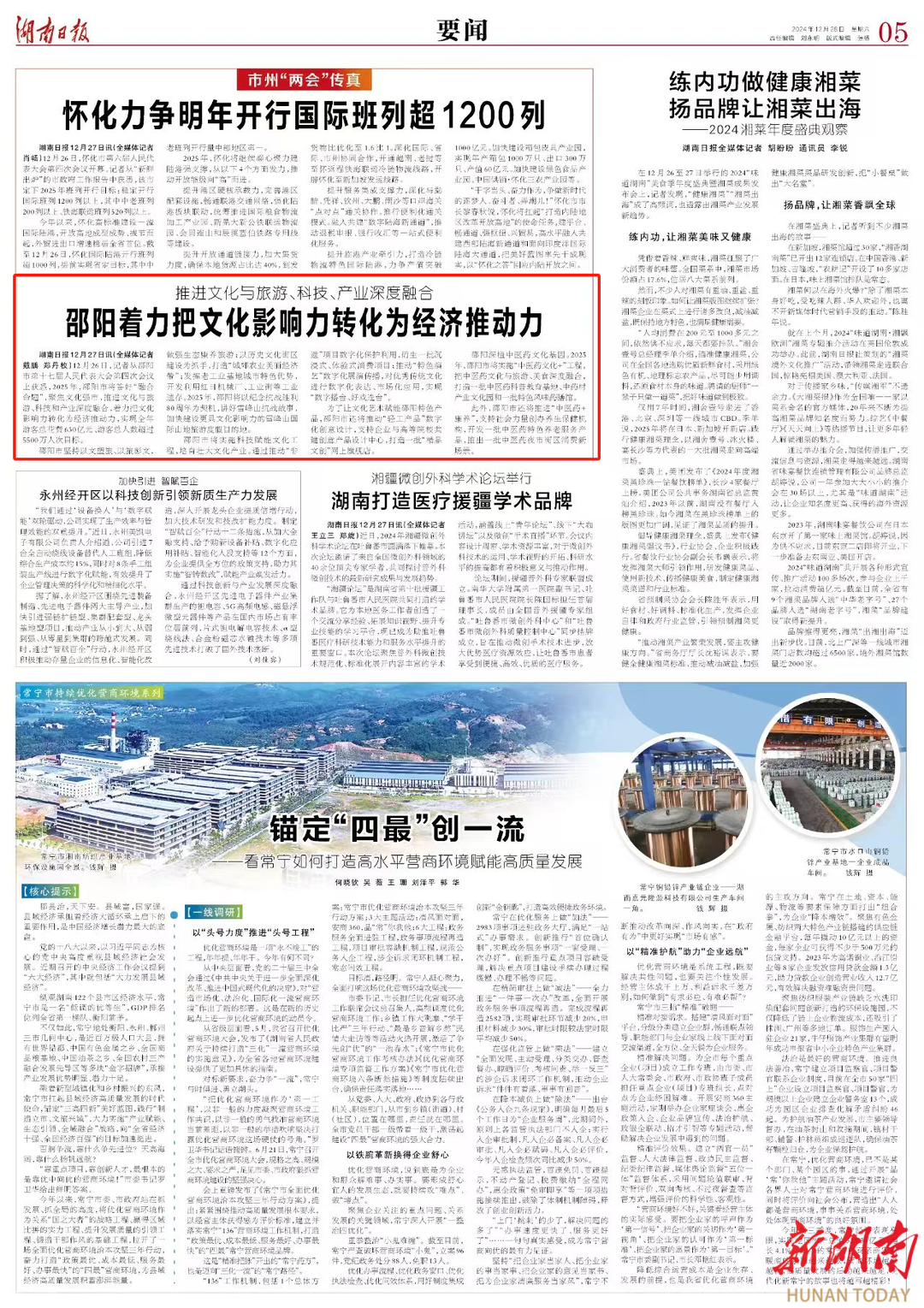 邵阳市坚持以文塑旅、以旅彰文,做强生态康养旅游;以历史文化街区建设为抓手,打造“城郊农业美丽经济带”;发挥老工业基地城市特色优势,开发利用红日机械厂、工业街等工业遗存。2025年,邵阳将以纪念抗战胜利80周年为契机,讲好雪峰山抗战故事,加快建设更具文化影响力的雪峰山国际山地旅游度假目的地。