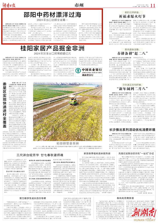 邵阳市鼓励中药材种植加工企业抱团发展,与“一带一路”沿线12个国家建立供销合作,2024年实现山银花、百合、玉竹、黄精4味药材出口“零”的突破。