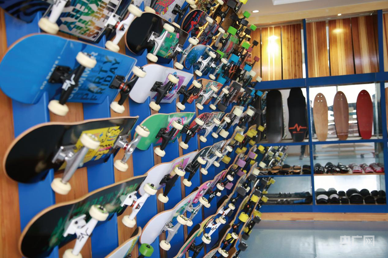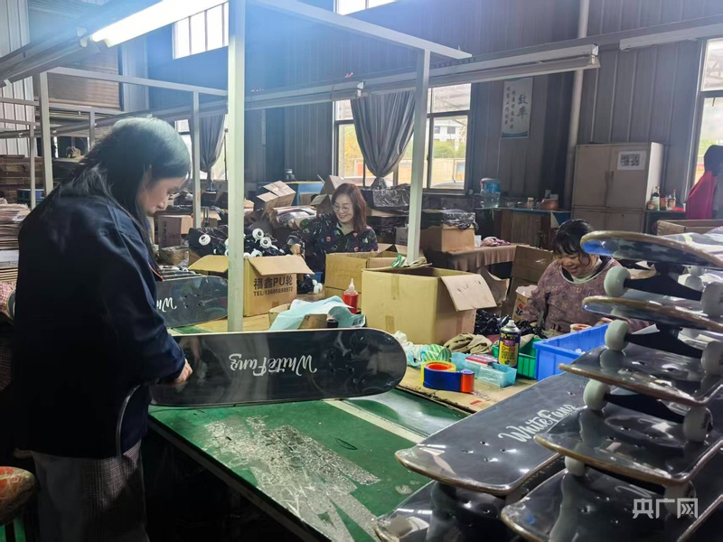 丰源体育车间里,工人正在制作滑板(央广网记者黄珂岚 摄)