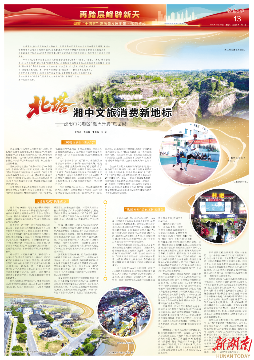今年以来,邵阳市北塔区以农文体旅融合为抓手,培育“一座塔、一壶酒、一桌菜”消费新场景,让全区洋溢着“烟火升腾”的浓烈氛围。北塔区委书记张龚表示,北塔的农文体旅融合,是市委“强心战略”下的北塔实践,正走出一条“以农为基、以文为魂、以体为核,以旅为桥”的特色发展之路。下一步将持续做好“融”的文章——让农业园区变景区、农特产品变文旅商品、民俗文化变体验项目、体育赛事变场景,让北塔不仅成为中心城区的“后花园”,更成为人人向往的“开心幸福地”,打造湘中文旅新地标。