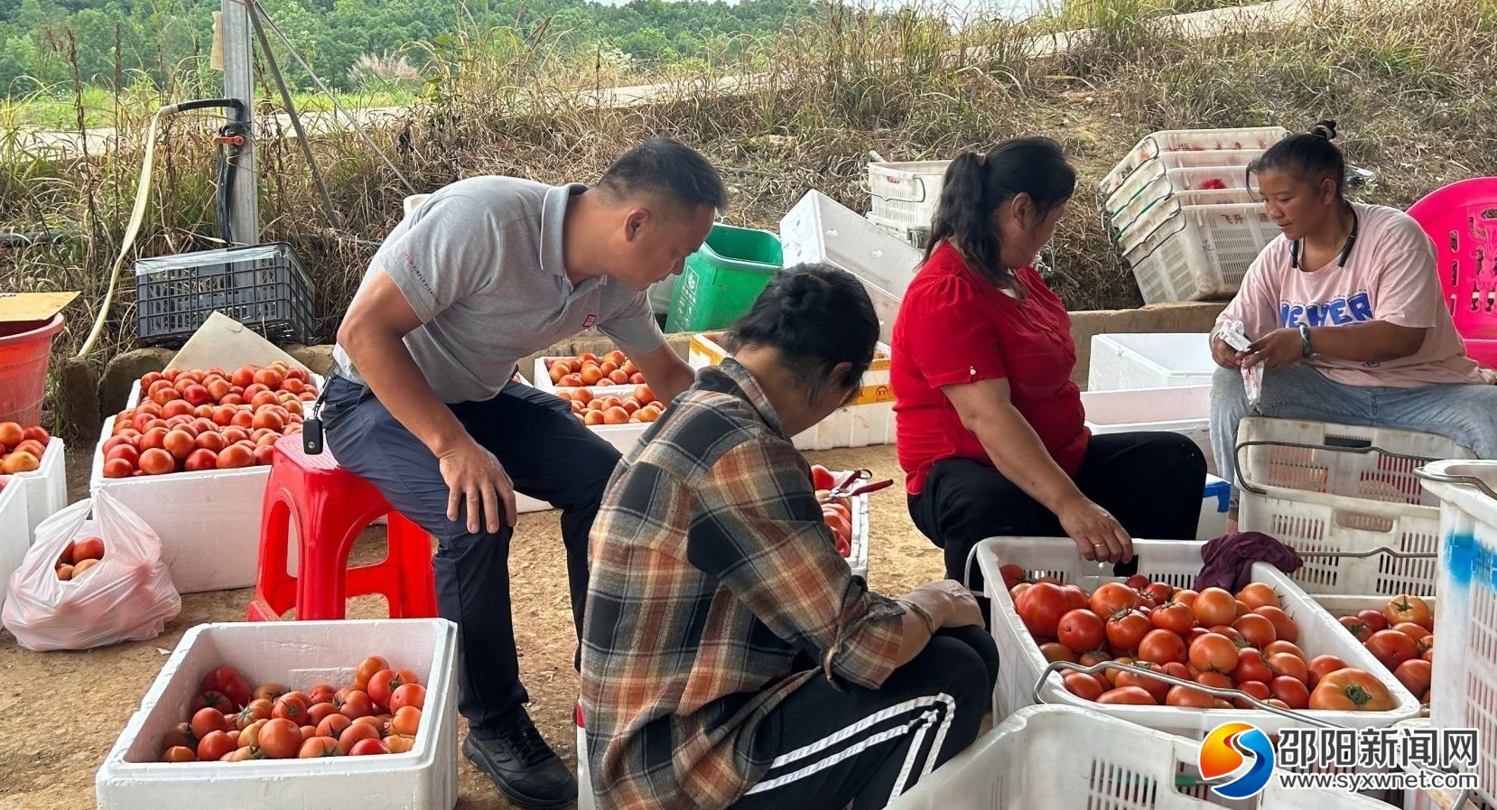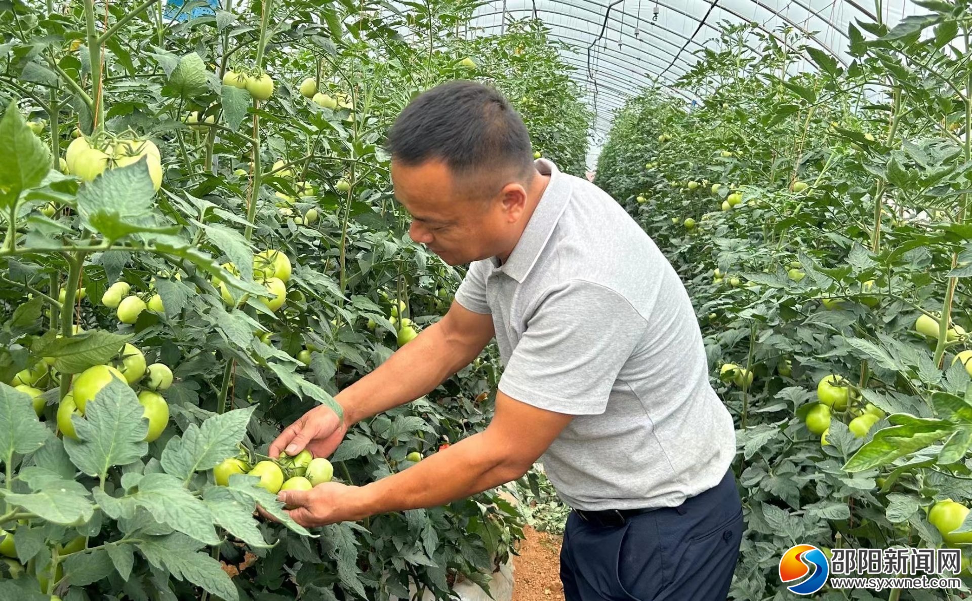 邵阳新闻网6月15日讯(通讯员 曾银莹)6月15日,走进北塔区陈家桥镇贺井村,乳白色的塑料大棚在阳光的照耀下显得格外耀眼。在大棚旁,邓宏鹰正带着村民在初步分拣番茄,准备运至蔬菜店和超市。