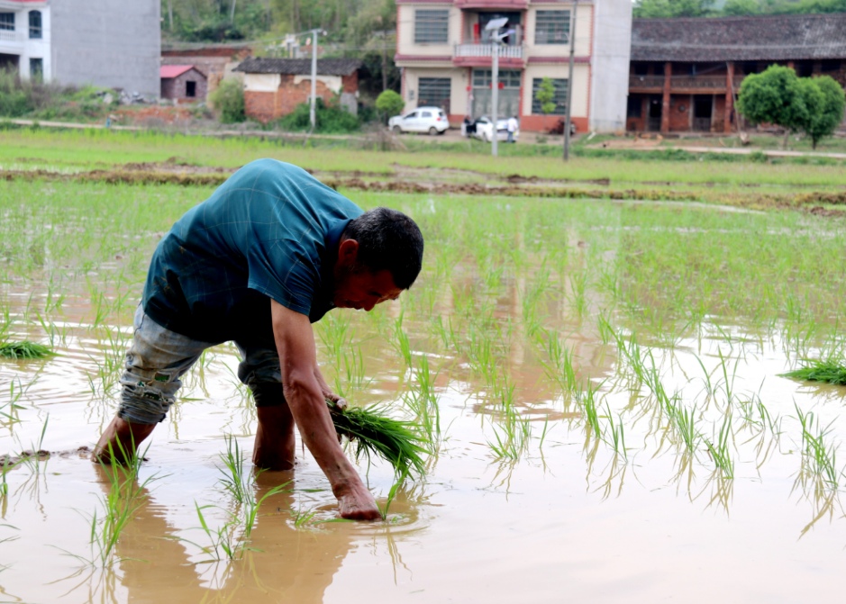 4月21日,邵阳市邵东九龙岭镇桥头冲村田野间,邵东常青种养专业合作社负责人郑伯平正带领村民抢抓农时移栽早稻。正是这名身高不足1.5米、右腿无法屈伸的汉子,自强自立、乐于助人,带领乡亲们奔向致富路,荣获全国基层农技推广补助项目“农业科技示范户”“湖南省‘最美阳光致富带头人(示范户)’”“邵阳好人”“邵东好人”等称号。