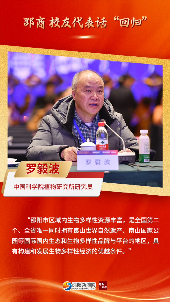 座谈会上,上海交通大学深圳研究院执行院长刘河洲,中国科学院院士、清华大学学术委员会副主任谢道昕,中国科学院植物研究所研究员罗毅波,浙江省邵阳商会会长蒋保强,福建省湖南邵阳商会会长蒋太柏,中山市邵阳商会会长欧永甜等邵商、校友代表先后发言。大家纷纷表达了回报家乡的强烈意愿,并就培育新质生产力、发展生物多样性经济、助推家乡产业建设等提出建议。