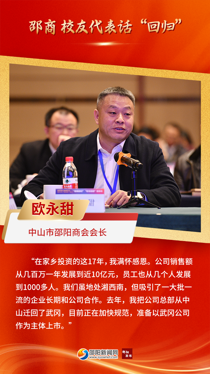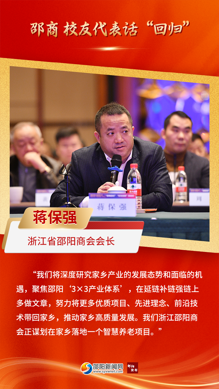 “无论前路多遥远,邵阳永远是大家最温暖的港湾;无论前路多艰辛,邵阳永远是您最坚强的后盾。”严华说,市委、市政府将继续发挥工商联、各地商会和人才工作站的作用,努力把全球邵阳人拧成一股绳、聚成一条心,守望相助、风雨同舟,更好助力邵商、校友的宏图大业;用心用情、群策群力提供全方位、全周期、集成式服务,让大家在邵发展更顺心、工作更舒心、生活更开心。