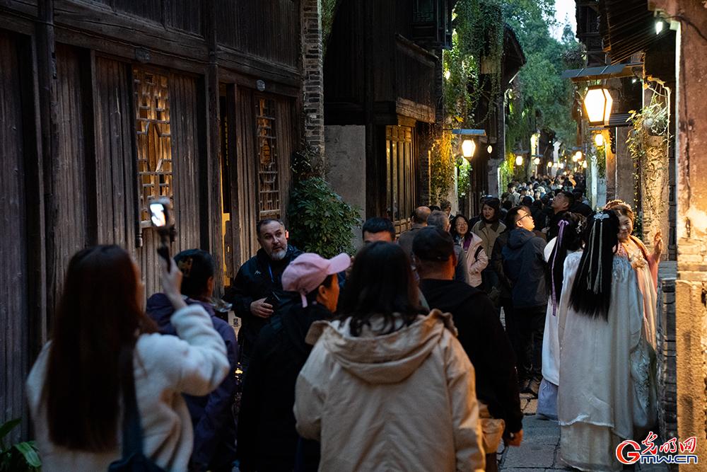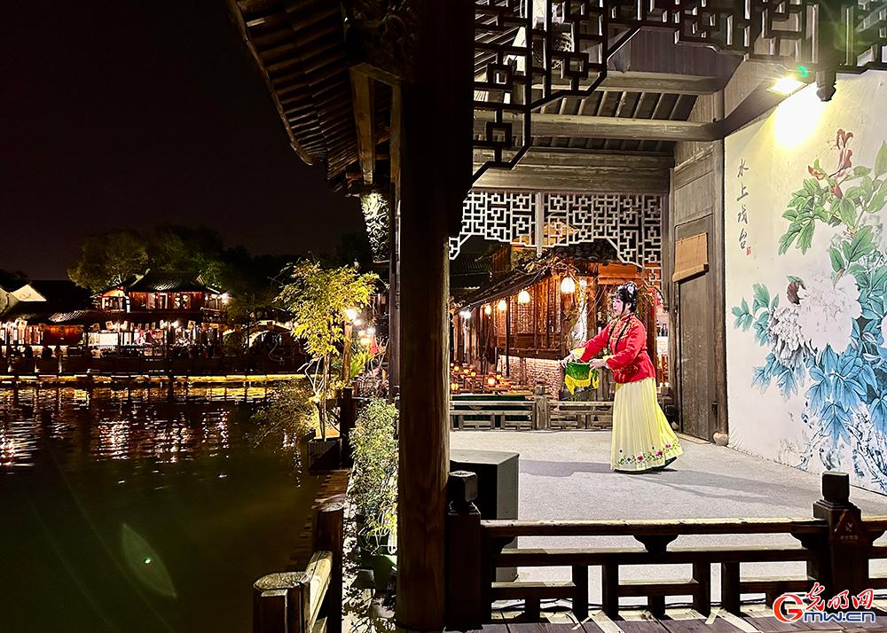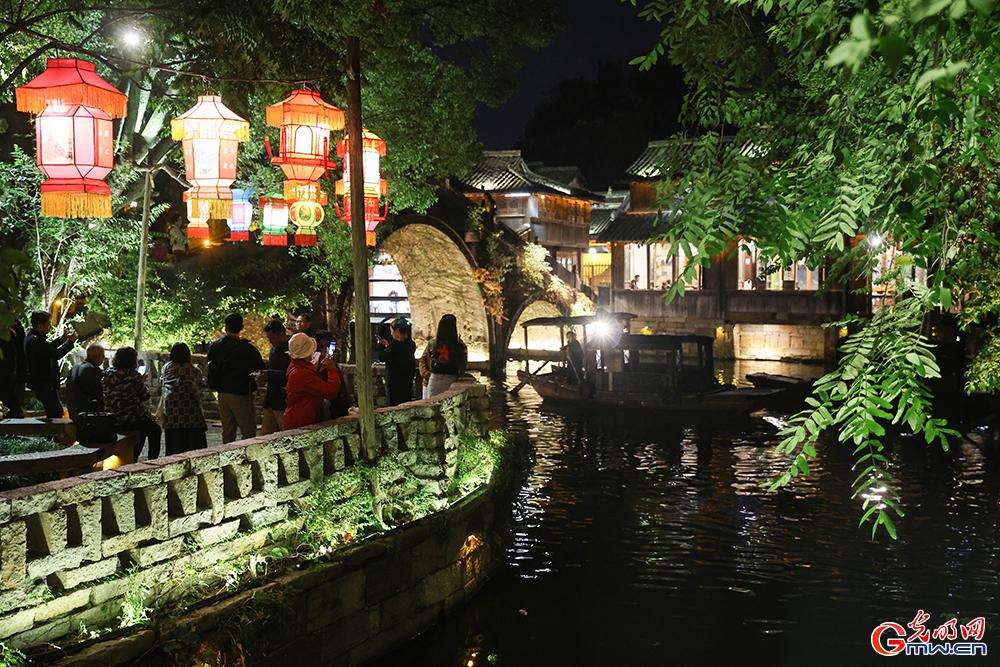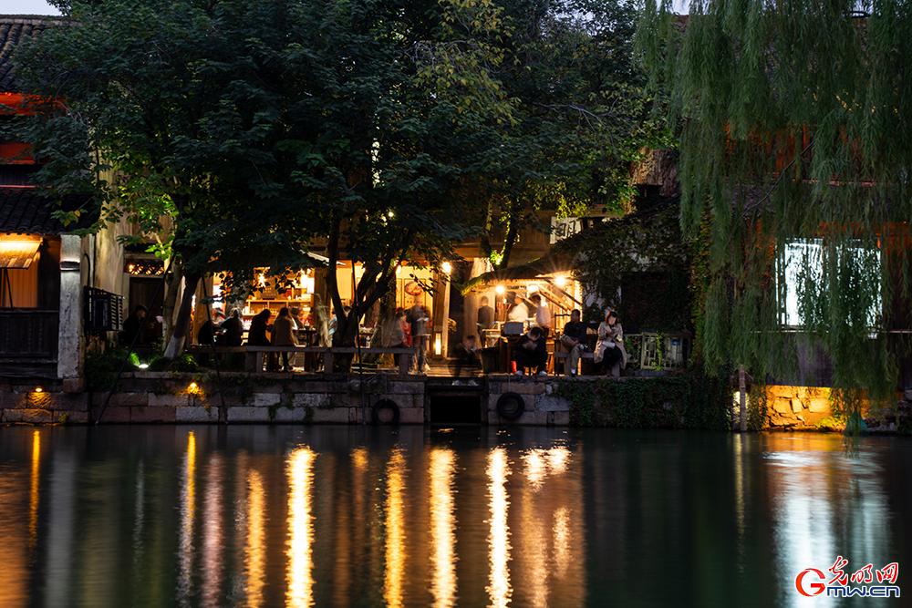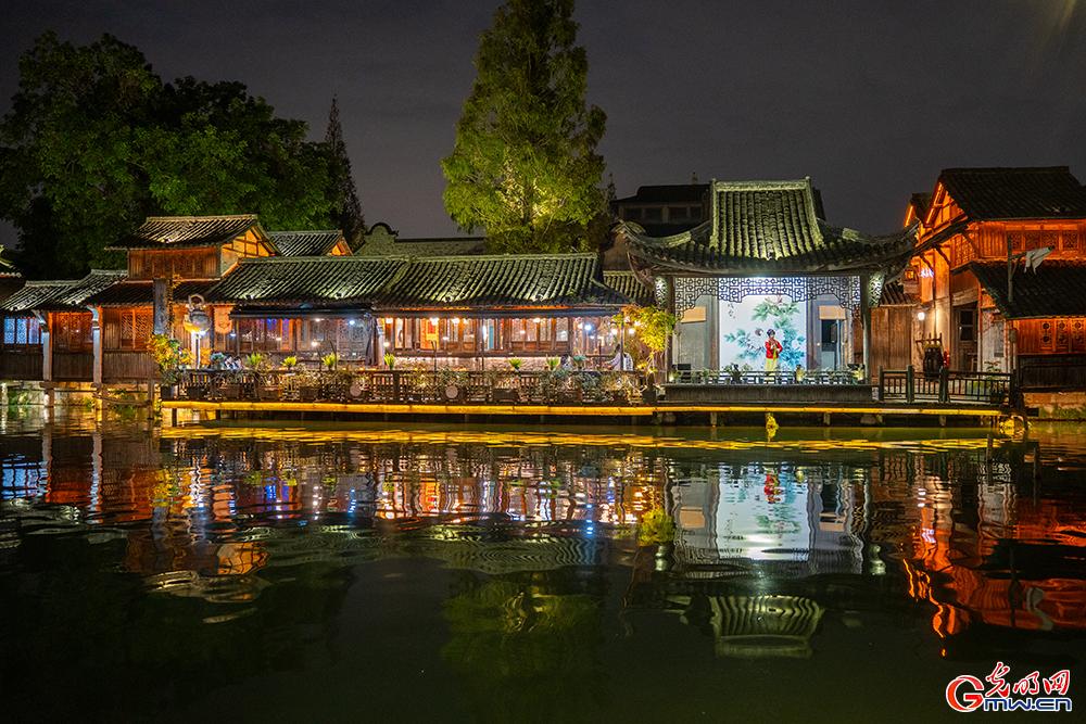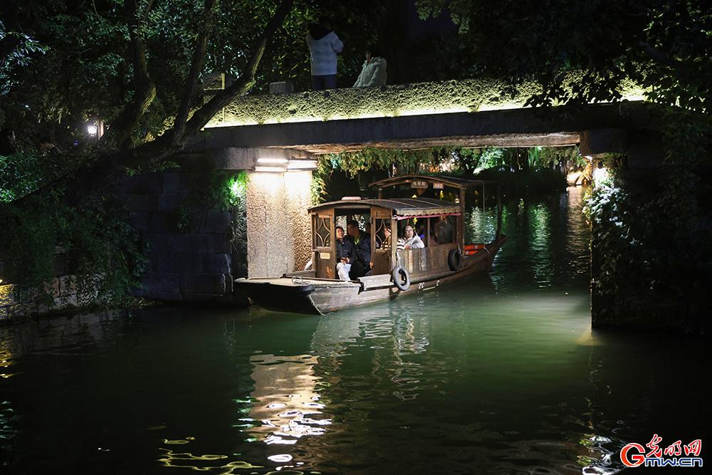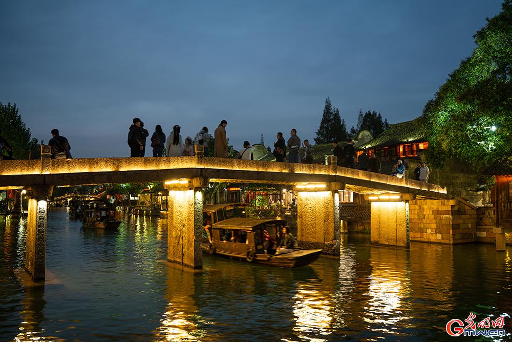 随着夜幕降临,河道两岸灯光点缀,乌篷船缓缓划过,水面映射出绚丽色彩。当暮色浸染白墙黛瓦,乌镇从素简水墨画蜕变为流光溢彩的数字梦境。