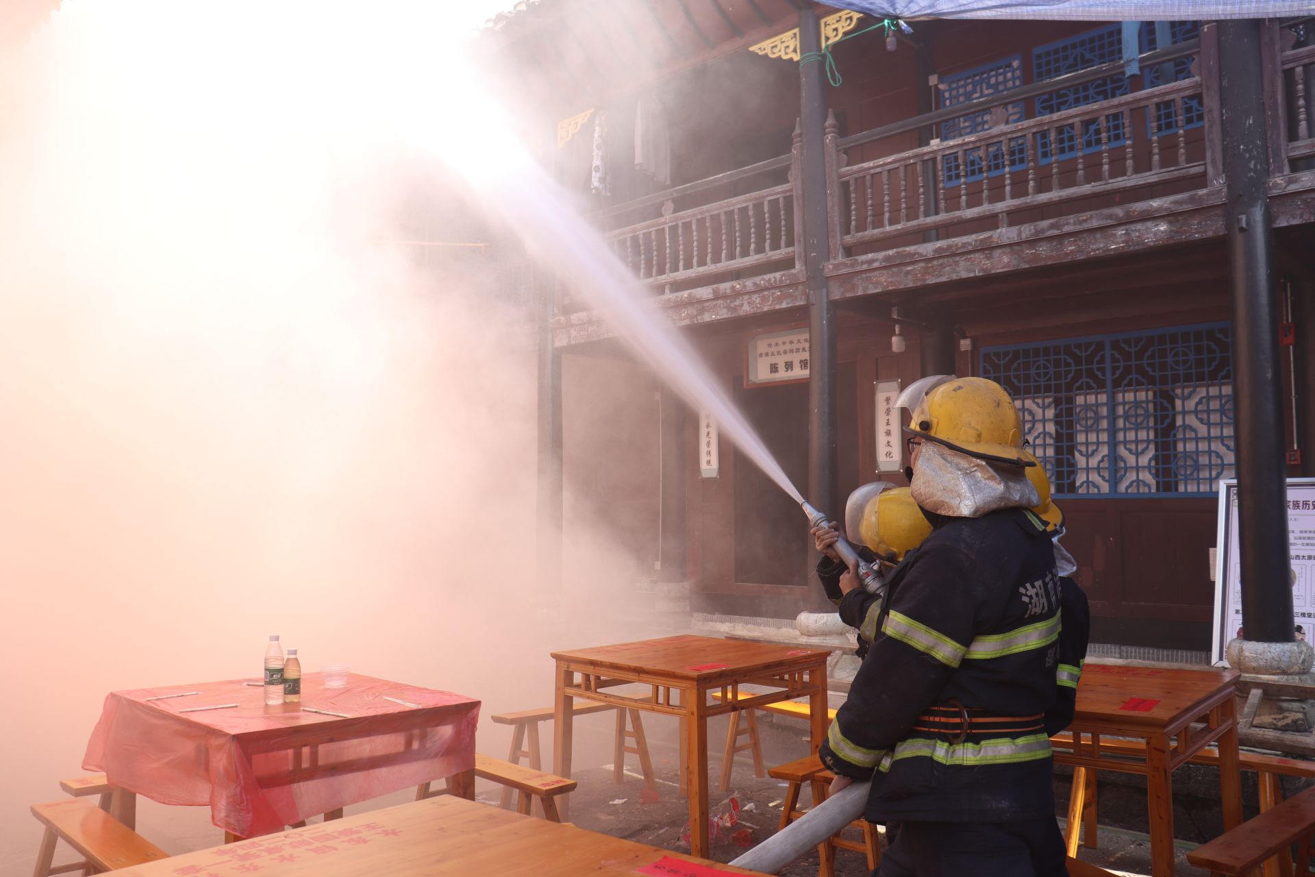 演练过程中,工作人员在宗祠空置处放置烟雾弹,模拟火灾场景。工作人员第一时间组织现场村民有序疏散,消防员们身着整齐的战斗服,分工明确,动作敏捷,迅速展开灭火救援行动。高压水枪喷射出强大的水流,如巨龙般扑向熊熊燃烧的“火焰”,经过紧张而激烈的战斗,“大火”被成功扑灭。