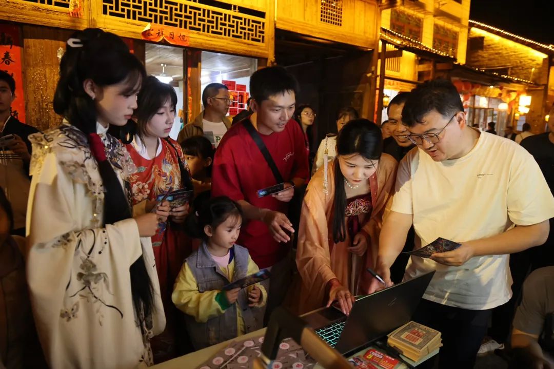 夜幕下的西直街宝庆古茶门前,集章抽奖队伍蜿蜒数十米。游客手持特制武冈明信片穿梭于青石巷弄,集满6枚店铺印章即可参与抽奖。"抽到2张银票马上就能当钱花!"游客张其兴奋地向记者展示战利品。据悉,这种仿古设计的银票可在百家商户直接抵扣,假期累计发放8万余元,有效撬动二次消费。