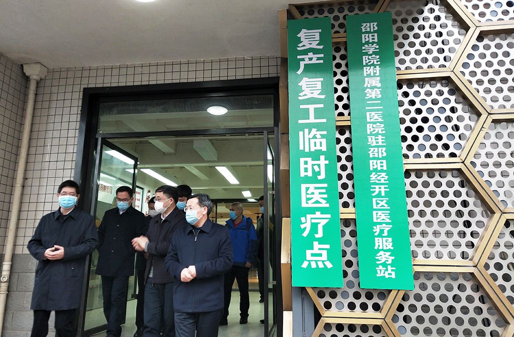 刘事青在邵阳学院附属第二医院驻邵阳经开区医疗服务站看望慰问医护人员。