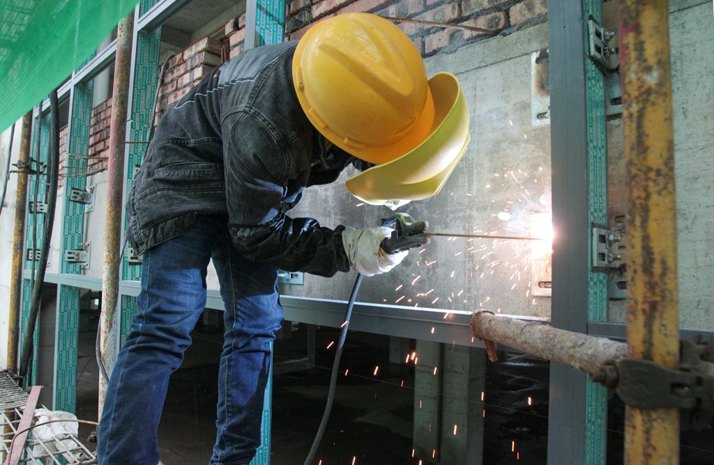 韦全集团智能终端产业园工人焊接玻璃幕墙