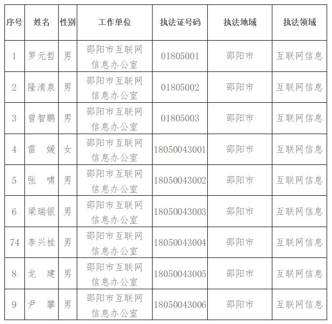 根据《中华人民共和国行政许可法》《中华人民共和国行政处罚法》《湖南省行政程序规定》等法律法规以及湖南省人民政府办公厅关于印发《湖南省全面推行行政执法公示制度、执法全过程记录制度、重大执法决定法制审核制度的实施方案》的通知(湘政办发〔2019〕23号)要求,现将邵阳市互联网信息办公室执法人员信息公示如下: