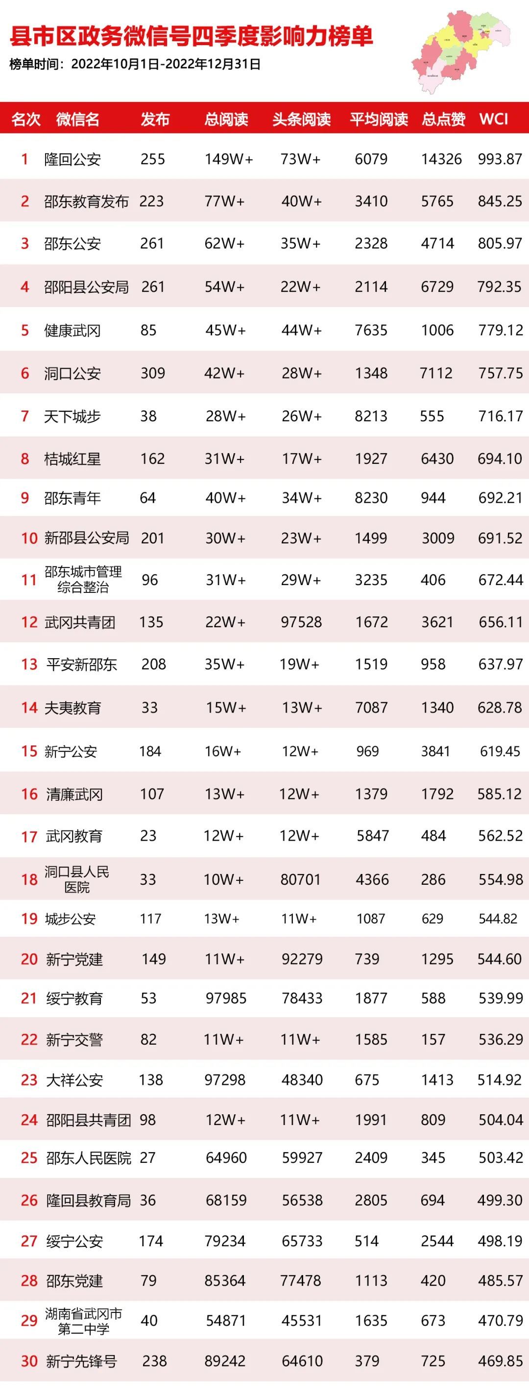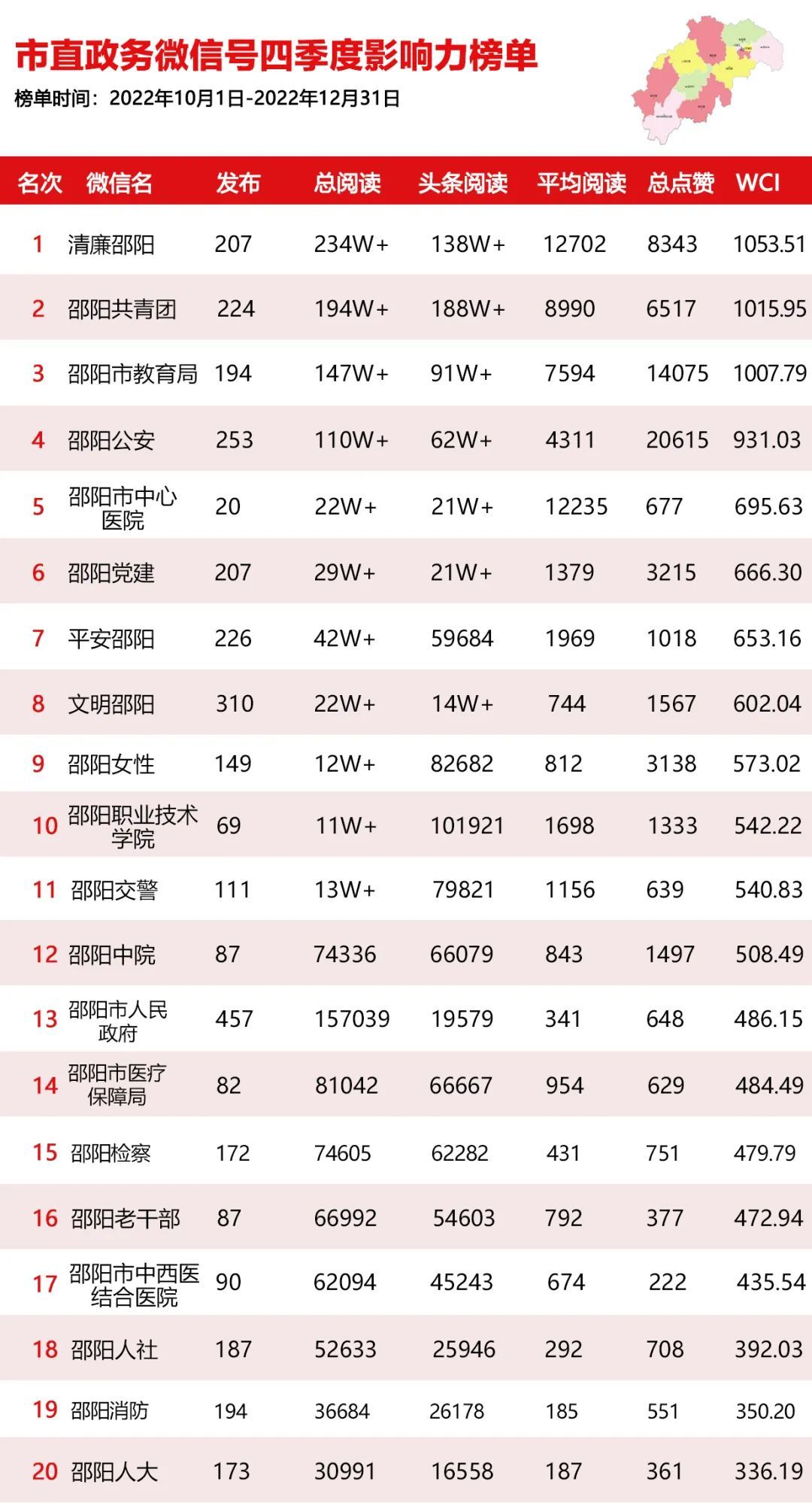 为落实党委(党组)网络意识形态工作责任制,推动邵阳市政务新媒体健康有序发展,提升政务微信公众号的传播力、引导力、影响力、公信力,市委网信办根据全市政务微信公众号周期内发布篇数、总阅读数、总点赞数等指标,综合计算影响力排名,现发布2022年第四季度《邵阳市政务微信公众号影响力榜单》。