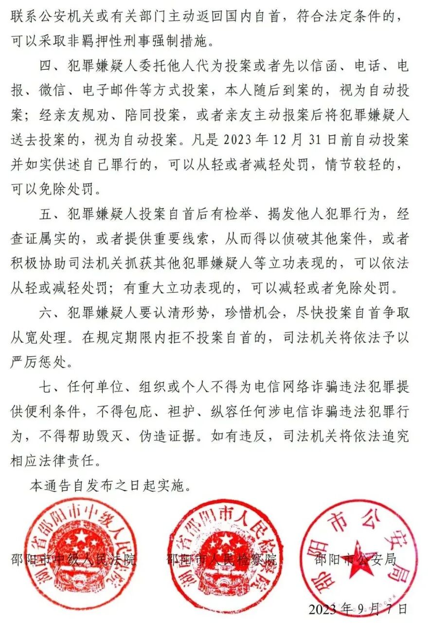 关于敦促涉电信网络诈骗犯罪嫌疑人员投案自首的通告