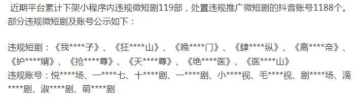 公告称,对于存在违规内容和行为的小程序或账号,平台将引导整改。拒不整改的,将对违规的剧集、视频和账号进行处置,处罚类型包括但不限于下架违规剧集、删除或屏蔽违规内容、对违规账号禁言或封禁等。