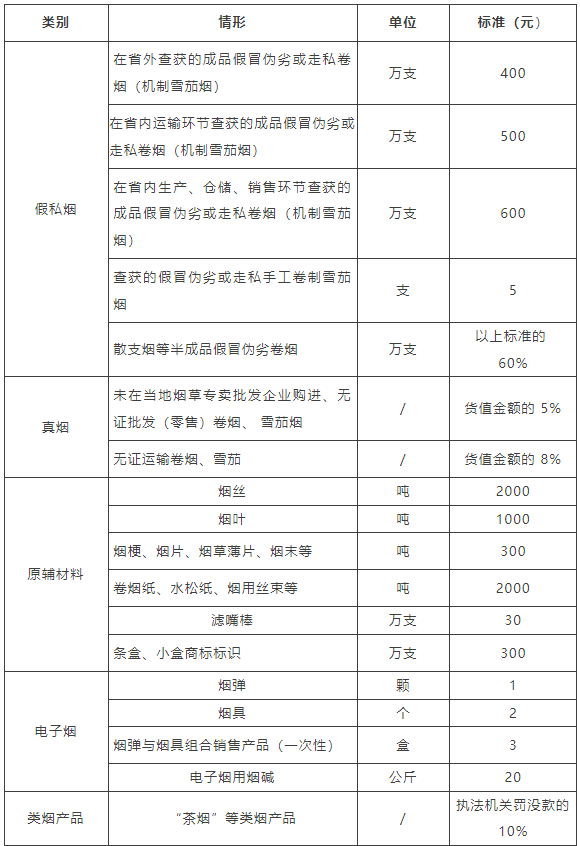 望广大人民群众积极举报涉烟违法犯罪线索,相关执法机关将严格保密举报人信息。举报线索经查证属实的,将依据举报查实涉案烟草物品,按照以下标准予以奖励: