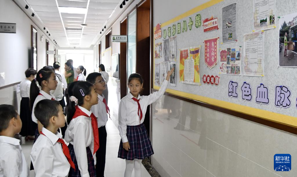 9月4日,北京市东城区黑芝麻胡同小学学生在校园内观看爱国主义教育绘画、板报展览。 9月4日,北京市东城区黑芝麻胡同小学开展以“峥嵘岁月八十载,红色血脉永传承”为主题的新学期爱国主义教育思政课。 新华社记者 李欣 摄