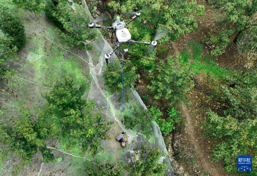 9月9日,在临安岛石镇的一片山核桃林上方,农用无人机将采收的山核桃运送出山(无人机照片)。 白露过后,浙江杭州临安区迎来一年一度的山核桃开杆采收季,人们忙着采摘、加工山核桃,供应市场。 新华社记者 翁忻旸 摄