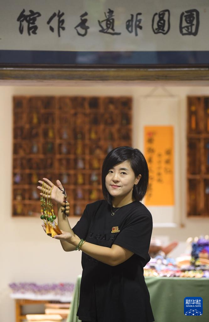 9月9日,在临安龙岗镇一家山核桃生产企业,负责人陈洁展示利用山核桃空籽制作的文创产品。 白露过后,浙江杭州临安区迎来一年一度的山核桃开杆采收季,人们忙着采摘、加工山核桃,供应市场。 新华社记者 翁忻旸 摄