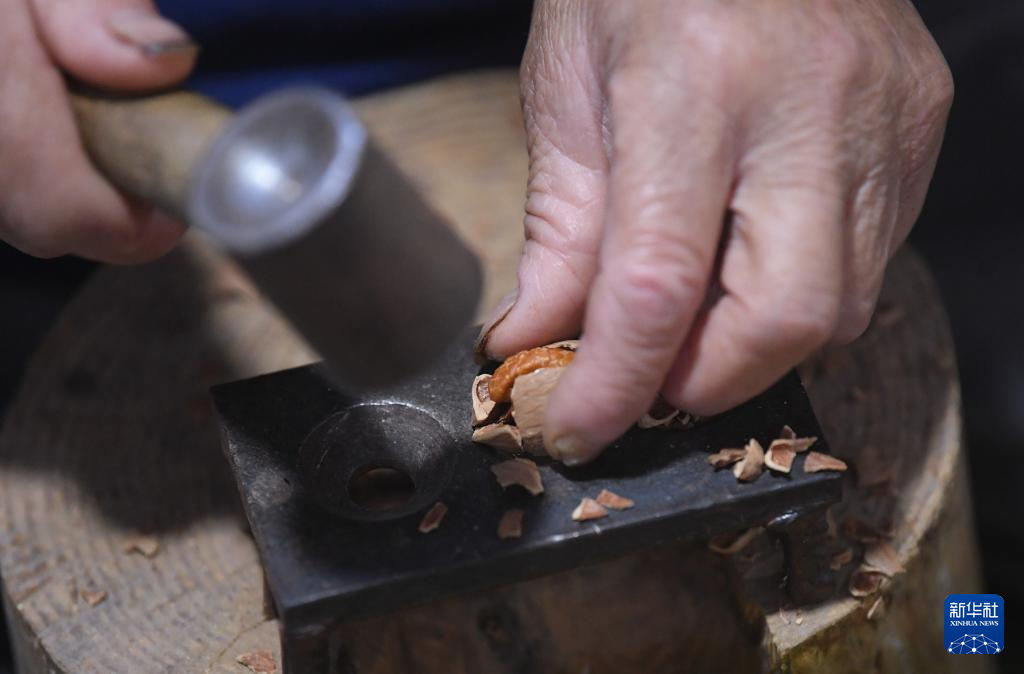 9月9日,在临安龙岗镇一家山核桃生产企业,工作人员通过手敲山核桃取整仁。 白露过后,浙江杭州临安区迎来一年一度的山核桃开杆采收季,人们忙着采摘、加工山核桃,供应市场。 新华社记者 翁忻旸 摄