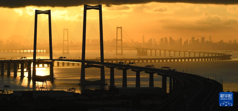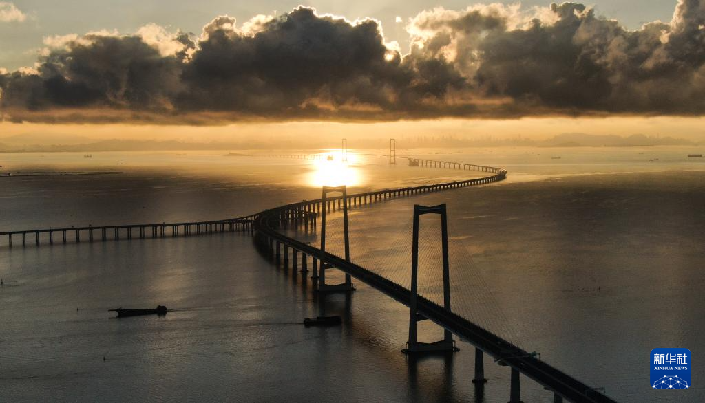 9月14日拍摄的沐浴在晨曦之中的深中通道。 珠江口伶仃洋上,深中通道沐浴在晨曦之中,长虹卧波、美不胜收。 深中通道全长约24公里,集“桥、岛、隧、水下互通”于一体,2024年6月30日正式通车。 新华社记者 邓华 摄