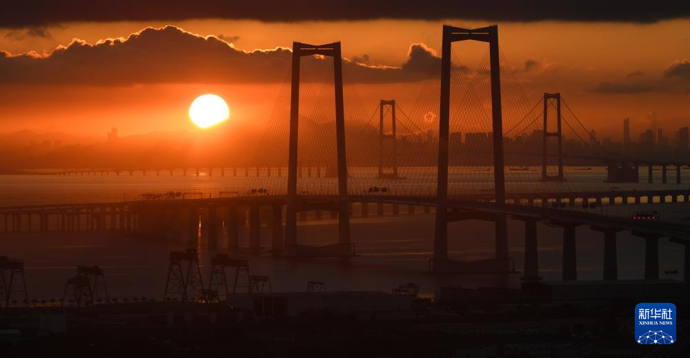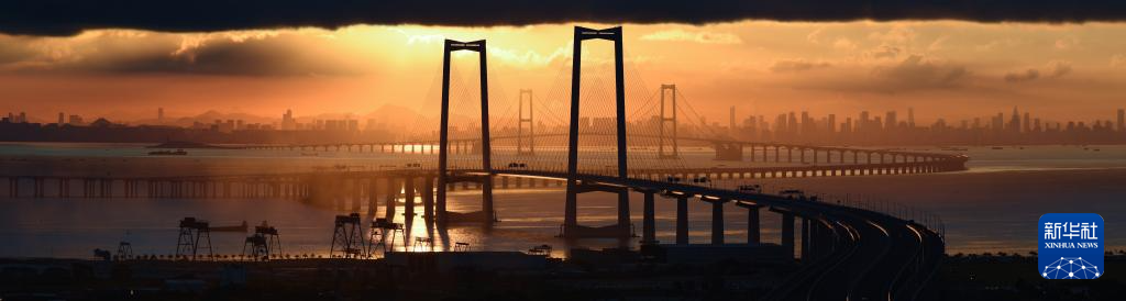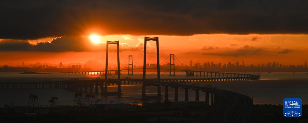 9月14日,深中通道与初升的朝阳交相辉映。 珠江口伶仃洋上,深中通道沐浴在晨曦之中,长虹卧波、美不胜收。 深中通道全长约24公里,集“桥、岛、隧、水下互通”于一体,2024年6月30日正式通车。 新华社记者 邓华 摄
