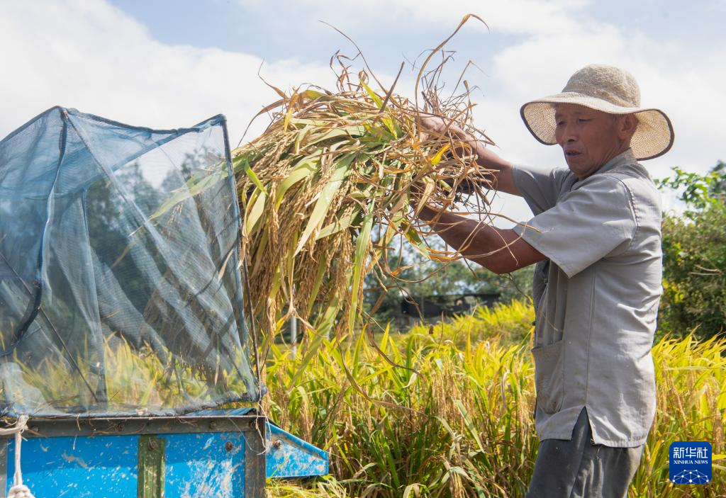 9月18日,稻农在重庆市黔江区五里镇的稻田里抢收稻谷(无人机照片)。 地处武陵山区腹地的重庆市黔江区五里镇水稻种植面积5300亩,是武陵山地区粮食主要产区之一。秋收时节,金黄色的水稻铺满山坡,稻农们利用晴好天气抢收稻谷,呈现出一派美丽的丰收画卷。 近年来,当地以“抓主粮、攻单产、增效益”为重点目标,在五里社区、甘溪村、胡家坝村、河南村建成水稻高产攻关示范片1000亩,实现水稻产业提质增效,推动主要粮食作物大面积单产提升。 新华社记者 唐奕 摄