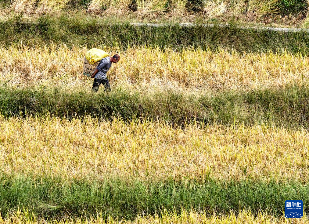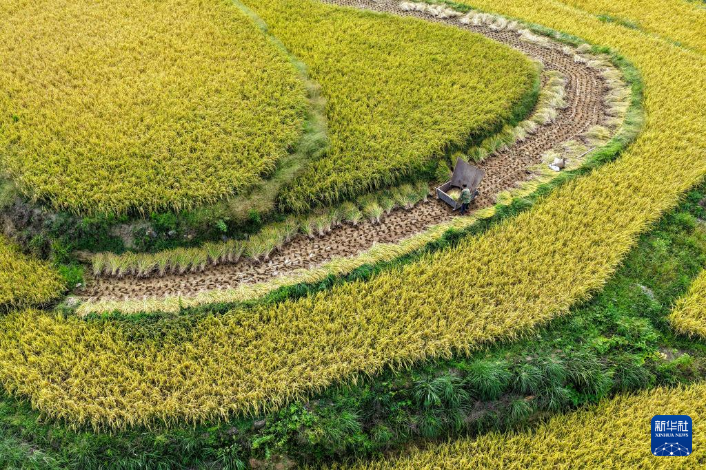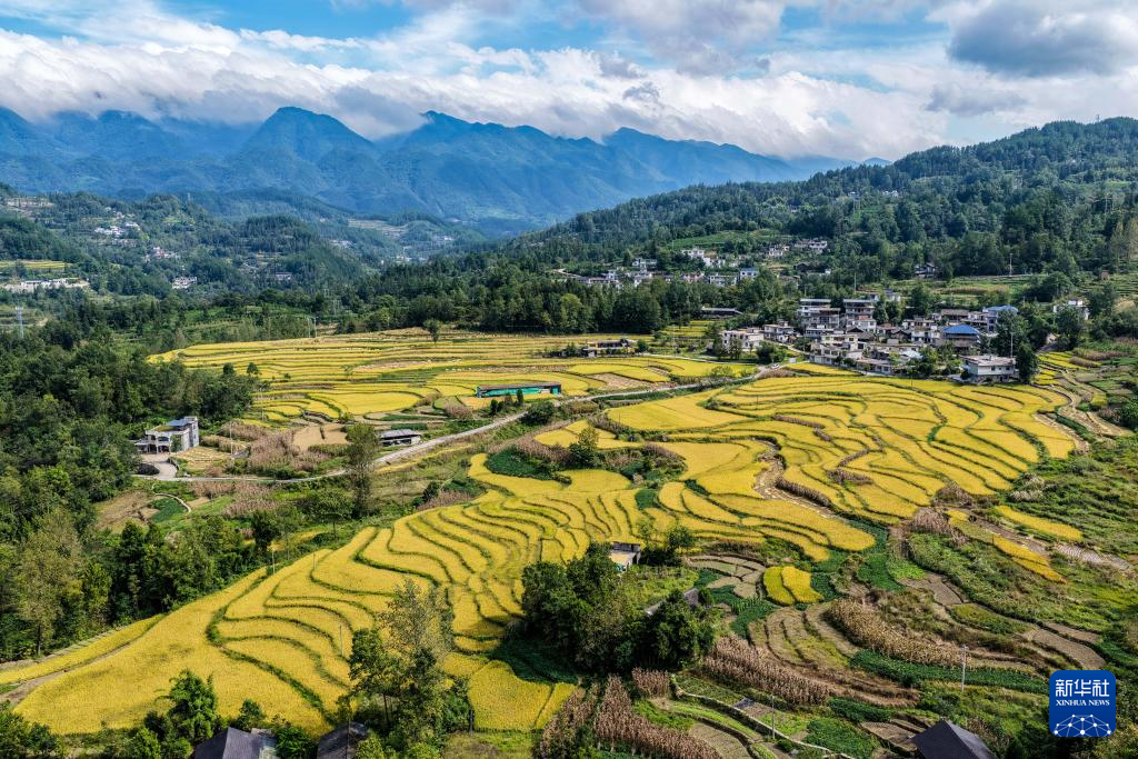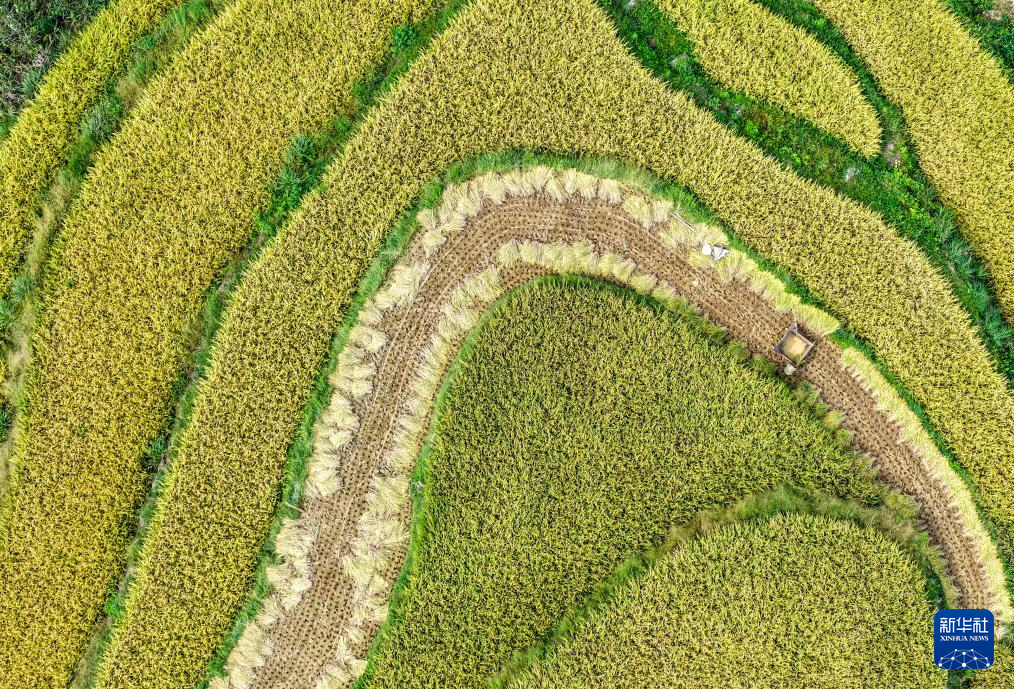 这是9月18日拍摄的重庆市黔江区五里镇梯田景色(无人机照片)。 地处武陵山区腹地的重庆市黔江区五里镇水稻种植面积5300亩,是武陵山地区粮食主要产区之一。秋收时节,金黄色的水稻铺满山坡,稻农们利用晴好天气抢收稻谷,呈现出一派美丽的丰收画卷。 近年来,当地以“抓主粮、攻单产、增效益”为重点目标,在五里社区、甘溪村、胡家坝村、河南村建成水稻高产攻关示范片1000亩,实现水稻产业提质增效,推动主要粮食作物大面积单产提升。 新华社记者 唐奕 摄
