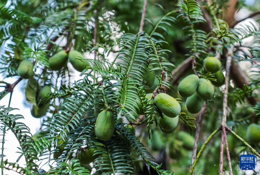 诸暨市赵家镇宣家山村的香榧树上硕果累累(9月18日摄)。 秋意渐浓,浙江诸暨市赵家镇一年一度的香榧采摘季如期而至。赵家镇位于浙江省诸暨市东北部,是著名的香榧产区,香榧种植面积约5万亩,全镇三分之一的人口从事与香榧相关产业。 新华社记者 徐昱 摄