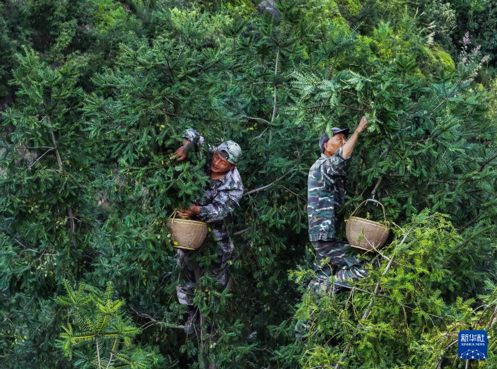 9月18日,诸暨市赵家镇宣家山村的香榧种植户在树上采摘香榧青果(无人机照片)。 秋意渐浓,浙江诸暨市赵家镇一年一度的香榧采摘季如期而至。赵家镇位于浙江省诸暨市东北部,是著名的香榧产区,香榧种植面积约5万亩,全镇三分之一的人口从事与香榧相关产业。 新华社记者 徐昱 摄