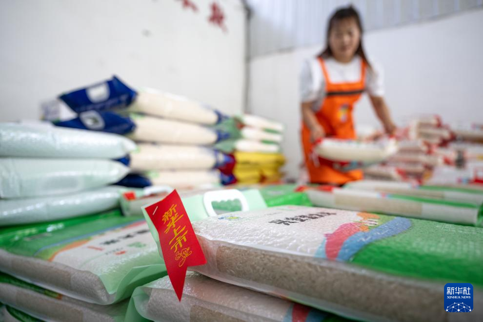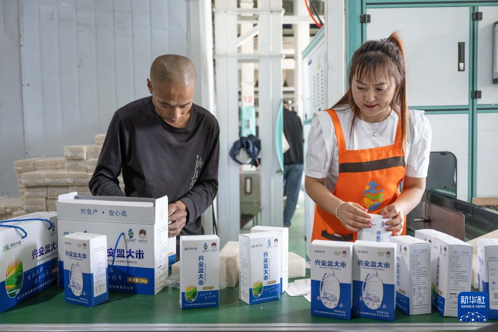 9月26日,社员在内蒙古兴安盟乌兰浩特市义勒力特镇明武水稻种植专业合作社打包新米。 金秋时节,内蒙古兴安盟乌兰浩特市的水稻喜迎丰收。农户们抢抓晴好天气,加紧收割加工。 新华社记者 贝赫 摄