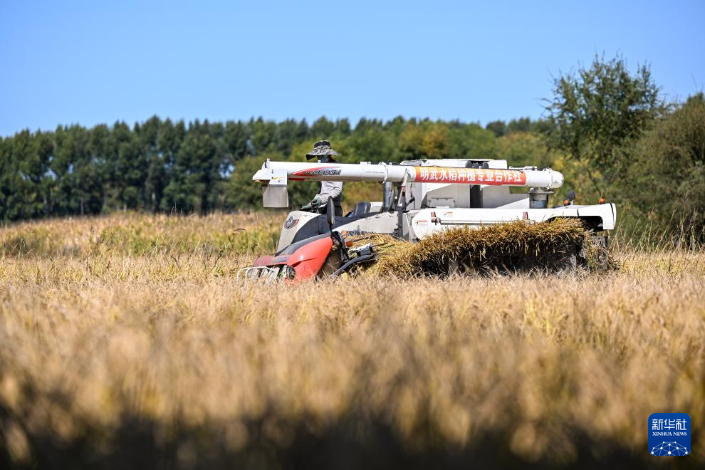 9月26日,农户在内蒙古兴安盟乌兰浩特市义勒力特镇一处稻田收割水稻。 金秋时节,内蒙古兴安盟乌兰浩特市的水稻喜迎丰收。农户们抢抓晴好天气,加紧收割加工。 新华社记者 贝赫 摄