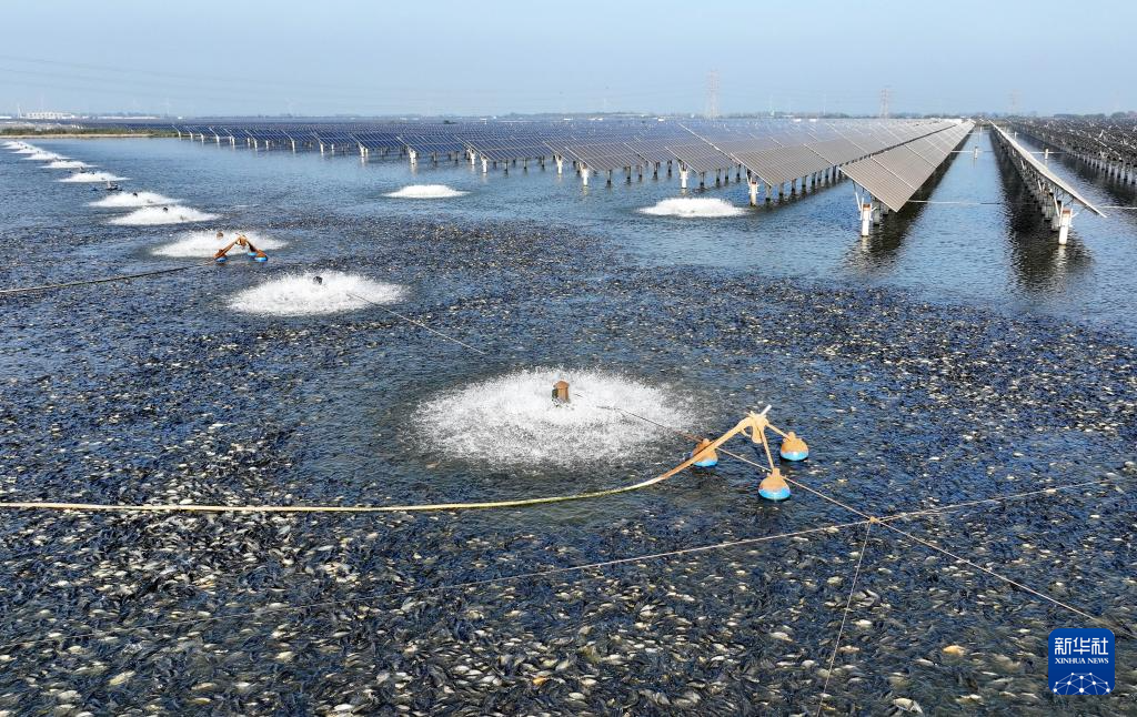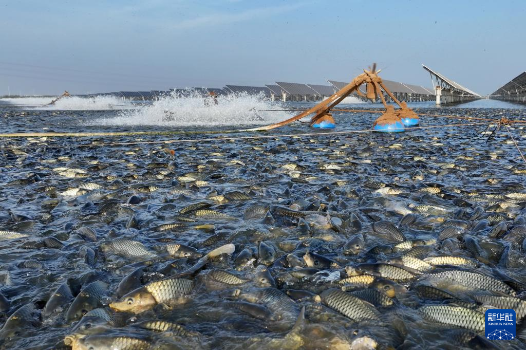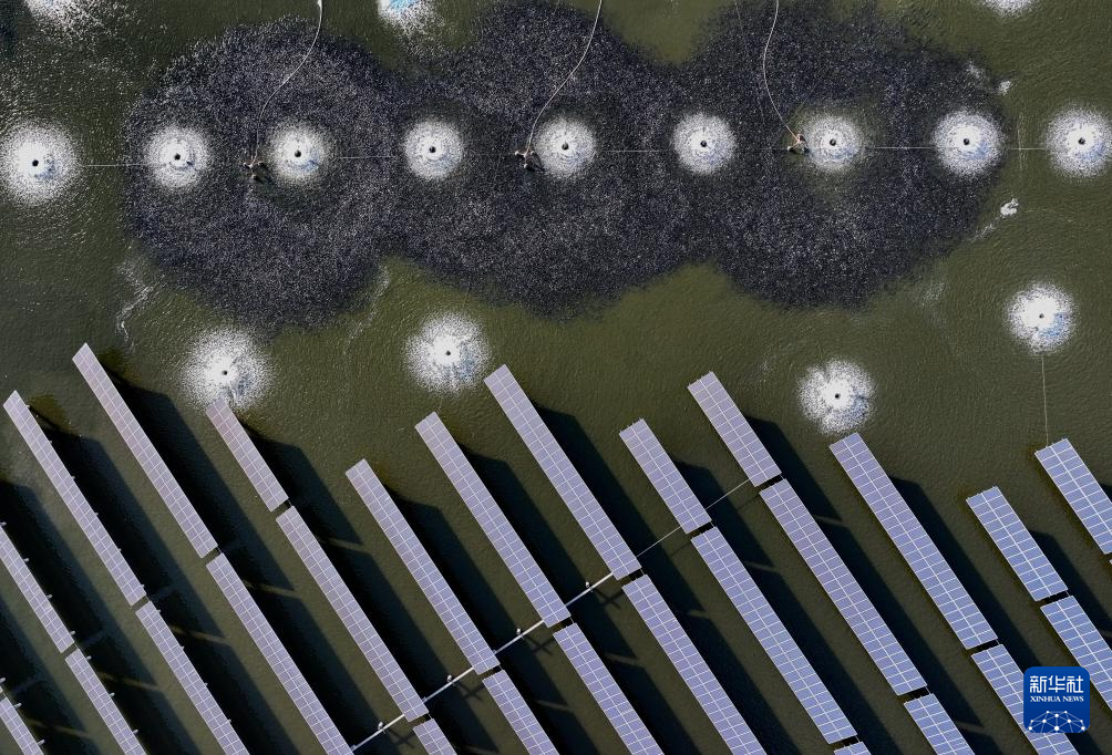 9月29日,鱼群在河北省唐山市丰南区黑沿子镇“渔光一体”现代渔业产业园鱼塘内觅食(无人机照片)。 金秋时节,河北省唐山市、秦皇岛市等冀东地区的稻谷弯腰泛金黄,池塘里水波荡漾鱼儿欢,呈现出一幅幅丰收在望的田园画卷。 新华社记者 杨世尧 摄