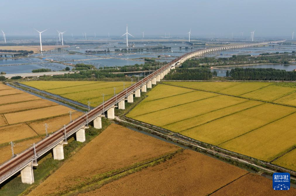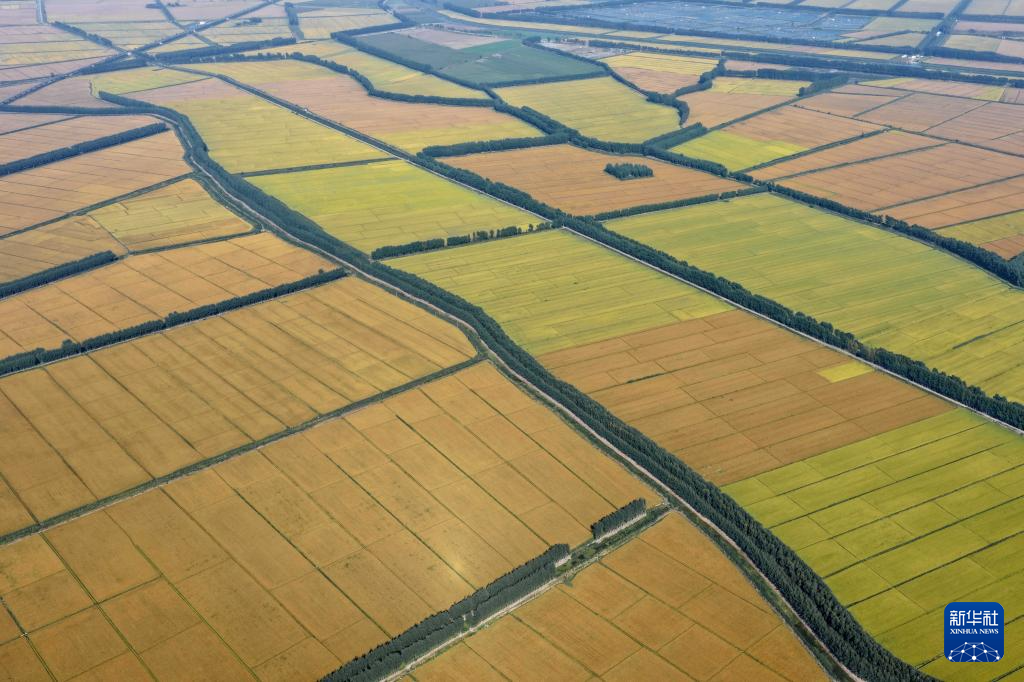 9月29日拍摄的河北省唐山市丰南区沿海水稻种植区的稻田风光(无人机照片)。 金秋时节,河北省唐山市、秦皇岛市等冀东地区的稻谷弯腰泛金黄,池塘里水波荡漾鱼儿欢,呈现出一幅幅丰收在望的田园画卷。 新华社记者 杨世尧 摄