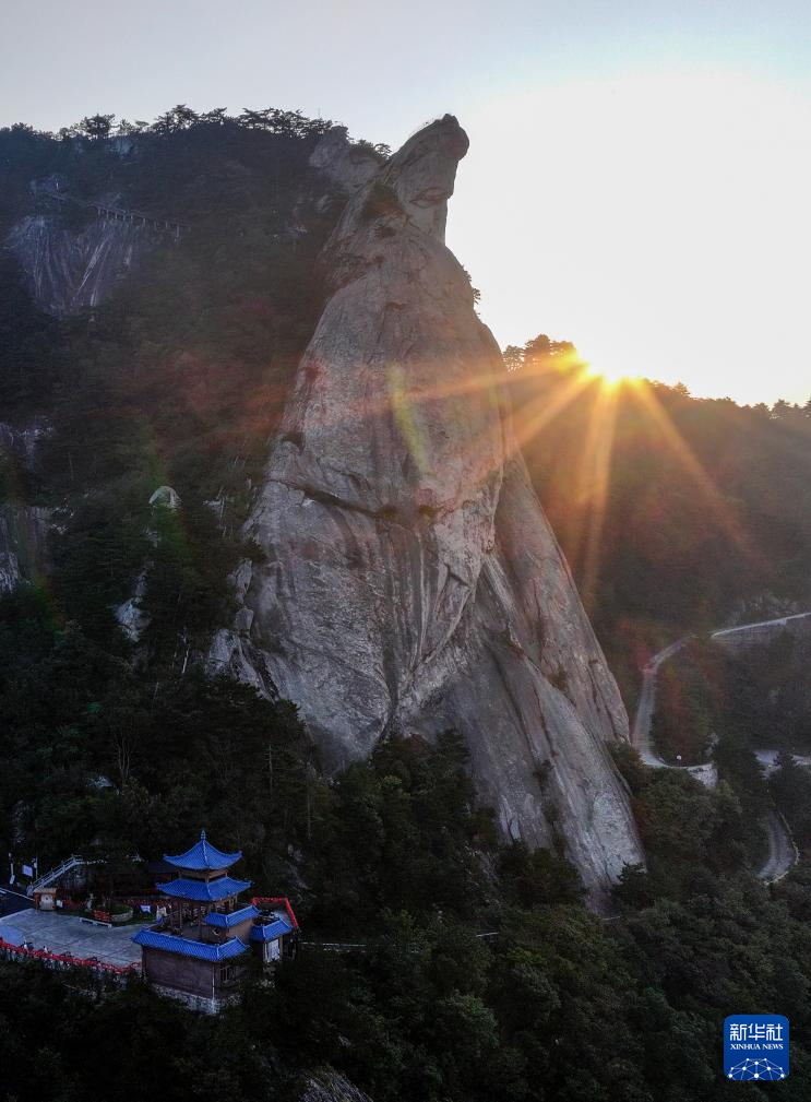 10月9日拍摄的晨曦中的龟峰山(无人机照片)。 秋日清晨,初升的太阳照在湖北省麻城市龟峰山景区的奇峰怪石上,勾勒出“龟峰旭日”的壮丽景象。 新华社记者 陈晔华 摄