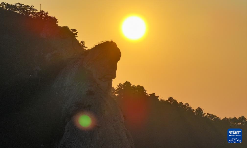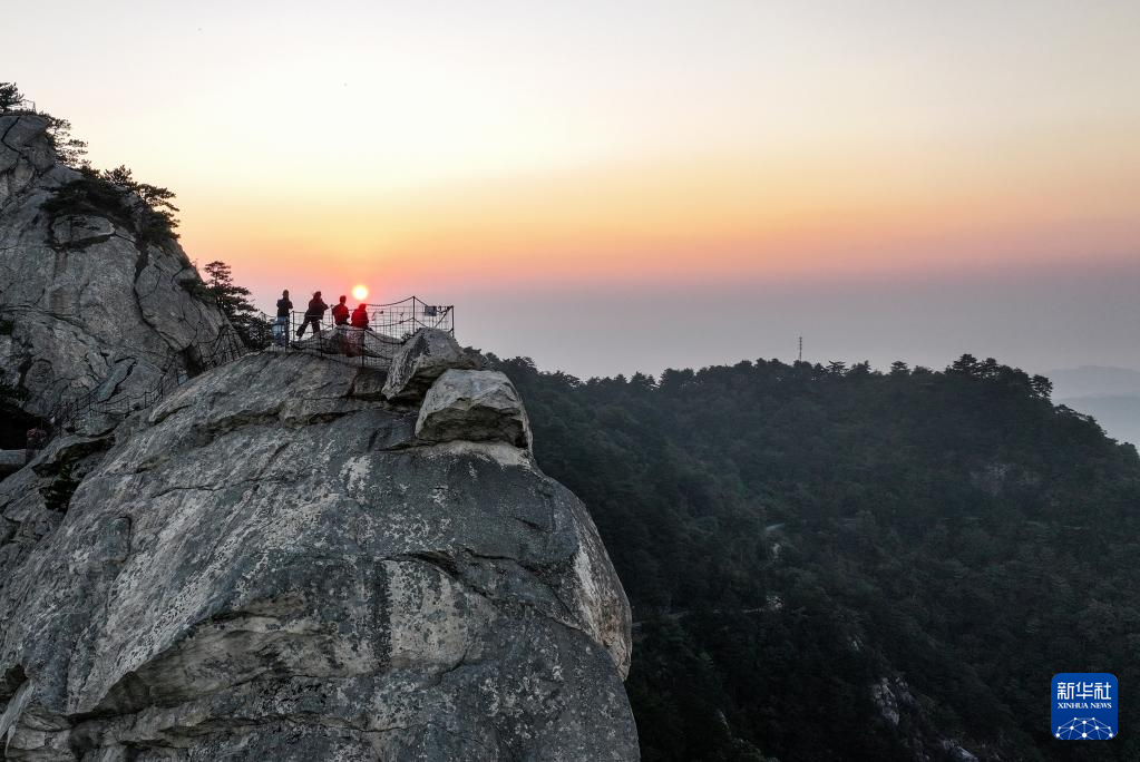 10月9日清晨,几名游客在龟峰山观日出(无人机照片)。 秋日清晨,初升的太阳照在湖北省麻城市龟峰山景区的奇峰怪石上,勾勒出“龟峰旭日”的壮丽景象。 新华社记者 陈晔华 摄