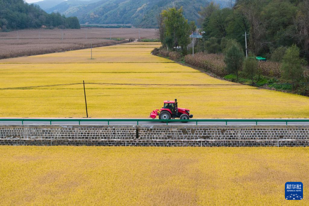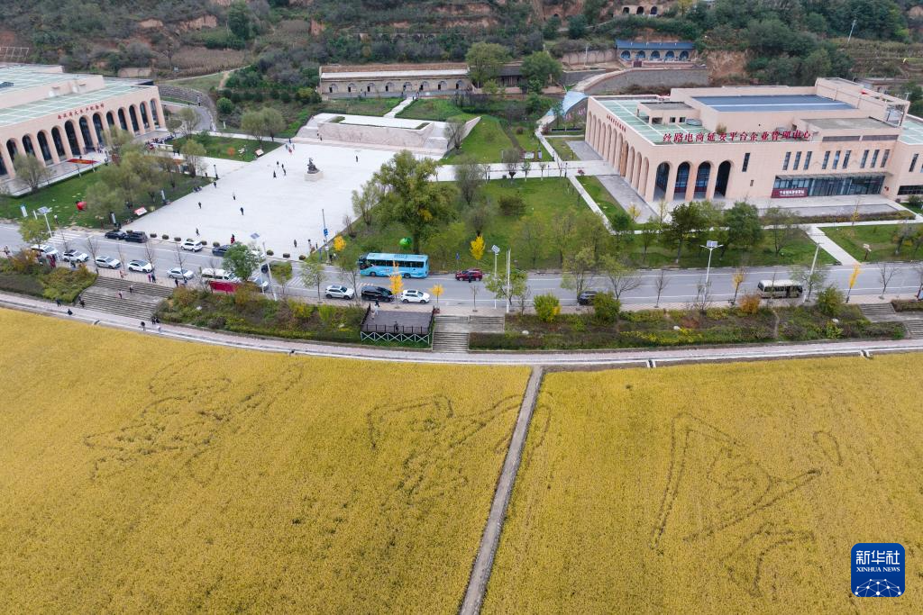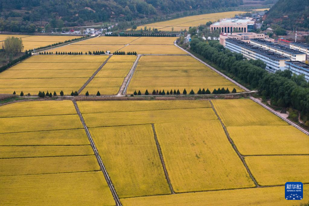 这是10月16日拍摄的南泥湾稻田景色(无人机照片)。 金秋十月,陕西延安南泥湾稻谷飘香,展现出“陕北好江南”的美丽图景,吸引游客参观打卡。 新华社记者 邵瑞 摄