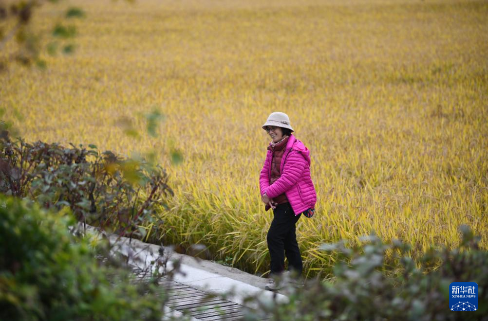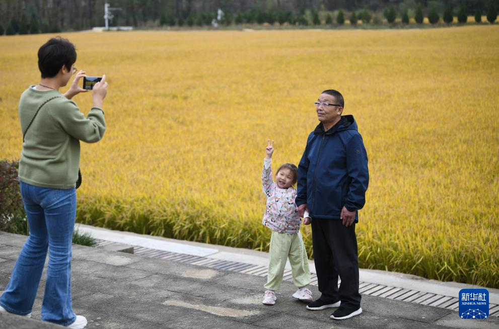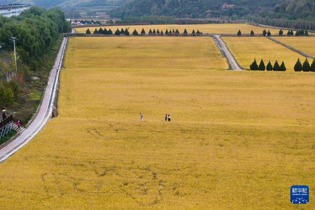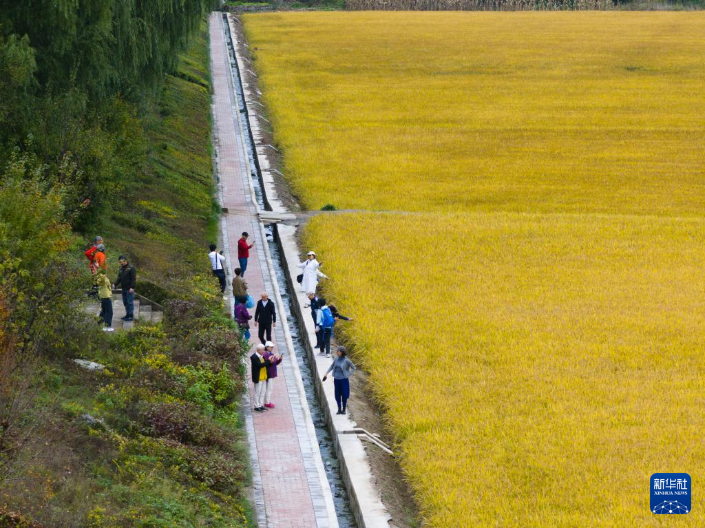 10月16日,游人在南泥湾稻田游览。 金秋十月,陕西延安南泥湾稻谷飘香,展现出“陕北好江南”的美丽图景,吸引游客参观打卡。 新华社记者 张博文 摄
