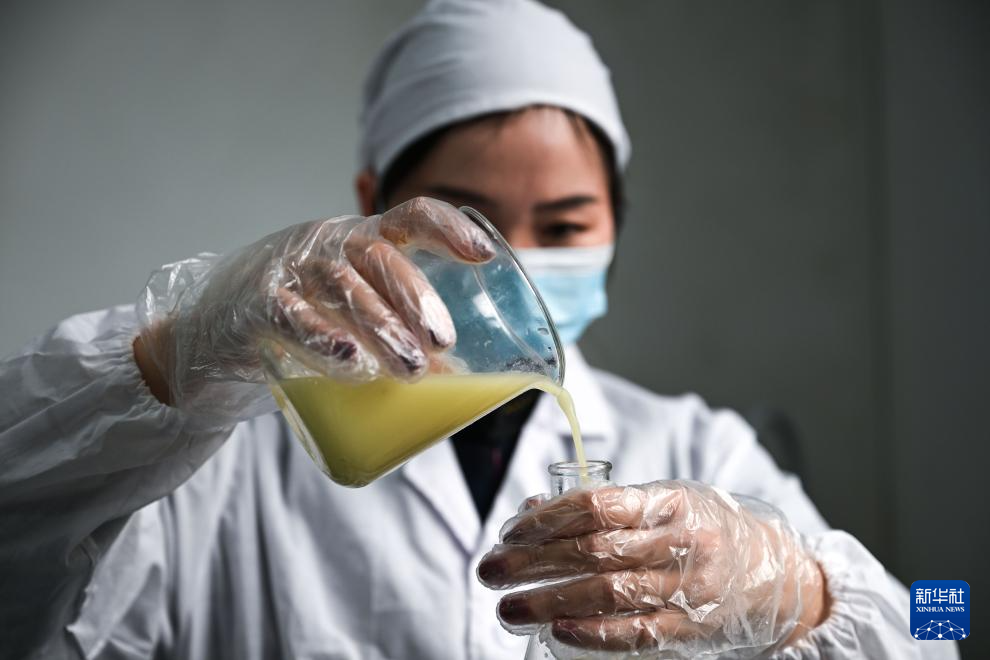 10月16日,在望谟县蔗香镇青柠檬现代产业园,工作人员对柠檬原汁进行初步检测。 2017年,贵州省黔西南布依族苗族自治州望谟县蔗香镇通过“东西部协作”,引进农业科技企业,依托当地良好的地理气候资源优势,利用荒山坡地,大力发展青柠檬种植4600亩,助力农业提质增效、农户“家门口”增收。同时,当地以精品青柠檬水果种植为载体,建立以培育、种植、加工、销售为一体的产业模式,把小柠檬做成助力乡村振兴的地方大产业。 新华社记者 杨文斌 摄