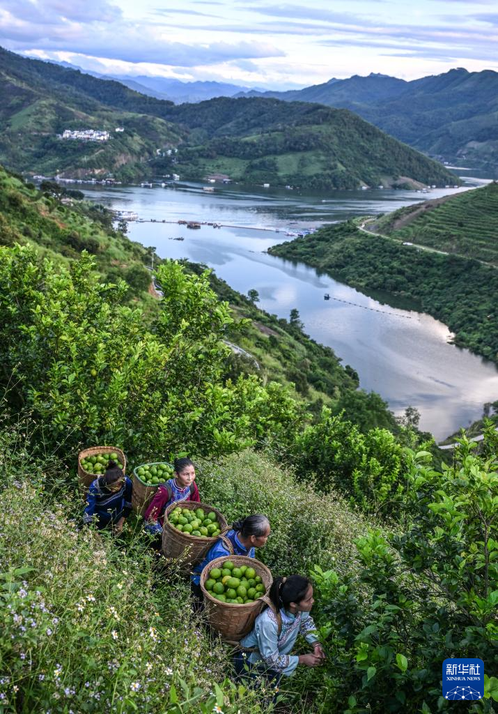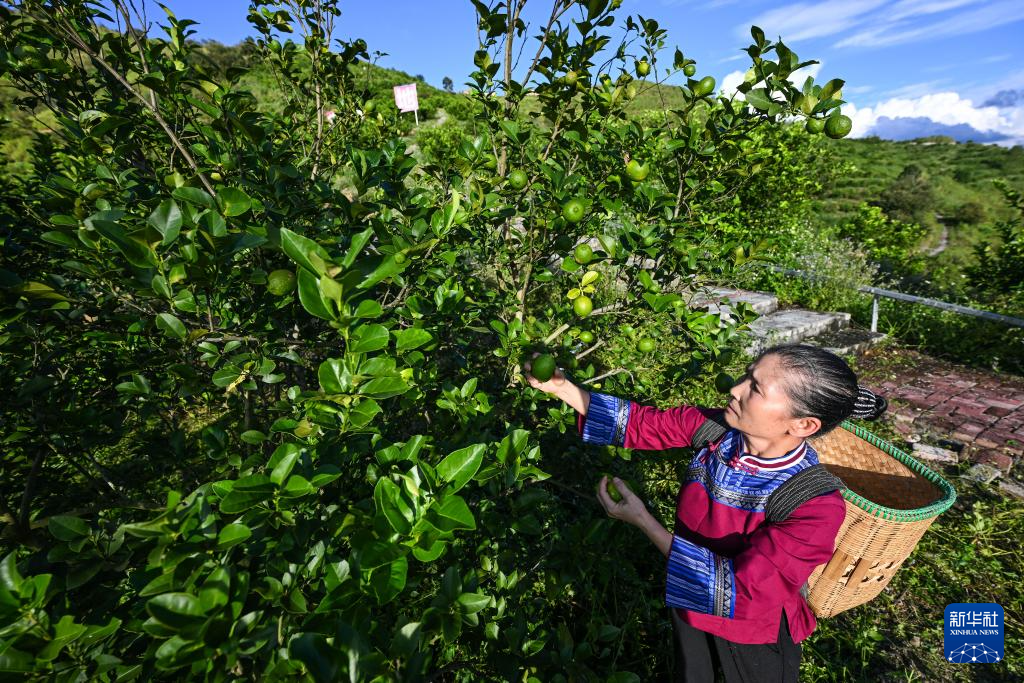 10月15日,村民在望谟县蔗香镇青柠檬基地采摘柠檬。 2017年,贵州省黔西南布依族苗族自治州望谟县蔗香镇通过“东西部协作”,引进农业科技企业,依托当地良好的地理气候资源优势,利用荒山坡地,大力发展青柠檬种植4600亩,助力农业提质增效、农户“家门口”增收。同时,当地以精品青柠檬水果种植为载体,建立以培育、种植、加工、销售为一体的产业模式,把小柠檬做成助力乡村振兴的地方大产业。 新华社记者 杨文斌 摄
