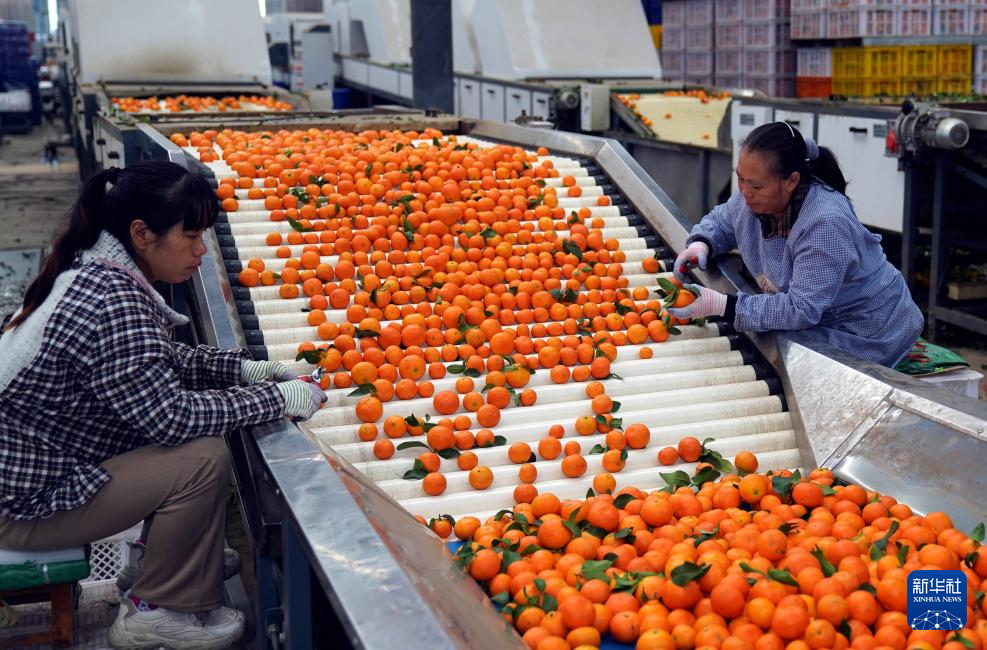 10月27日,在云南省华宁县华溪镇柑橘收购工厂,选果工人在分拣柑橘。 近年来,云南省华宁县因地制宜发展柑橘产业,建设柑橘产业园,推动产业绿色化、规模化、品牌化发展。产业园采取“公司+集体经济组织(专业合作社)+农户”的发展模式,带动农户增收。 新华社发(梁志强 摄)