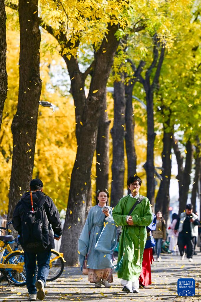 11月3日,行人走在北京前门西大街上。 正值深秋,北京街头秋色斑斓,景色怡人。 新华社记者 陈晔华 摄