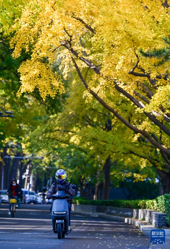 11月3日,市民骑电动车经过北京宣武门东大街。 正值深秋,北京街头秋色斑斓,景色怡人。 新华社记者 陈晔华 摄