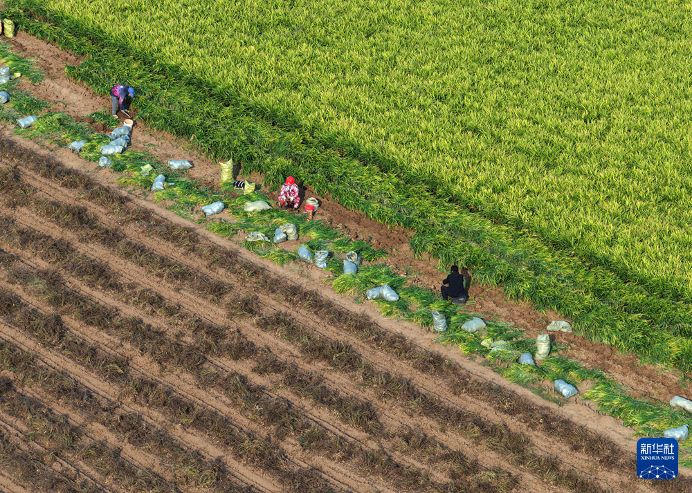 11月2日,河南省焦作市孟州市大定街道水运村农民在田间抢收小黄姜(无人机照片)。 深秋时节,各地农民抢抓农时加紧收获,处处是喜人的秋日好“丰”景。 新华社发(白水平摄)