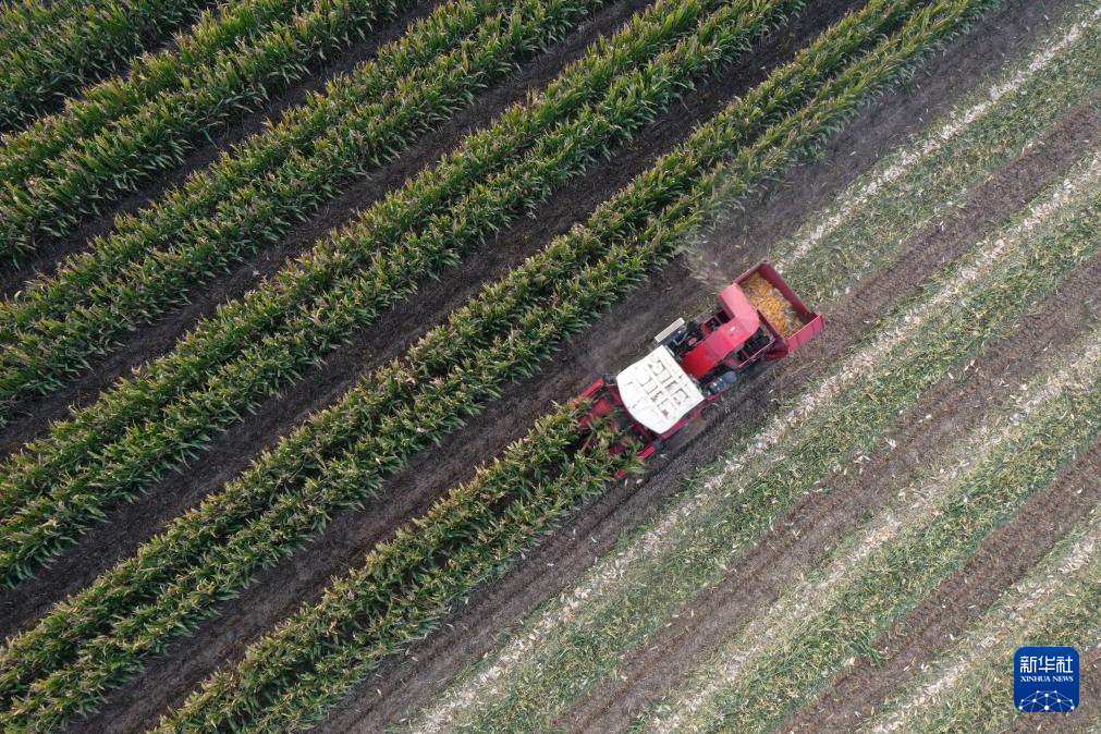 10月30日,农机手驾驶联合收割机在河南省沁阳市崇义镇南范村田间收获玉米(无人机照片)。 深秋时节,各地农民抢抓农时加紧收获,处处是喜人的秋日好“丰”景。 新华社发(杨帆摄)