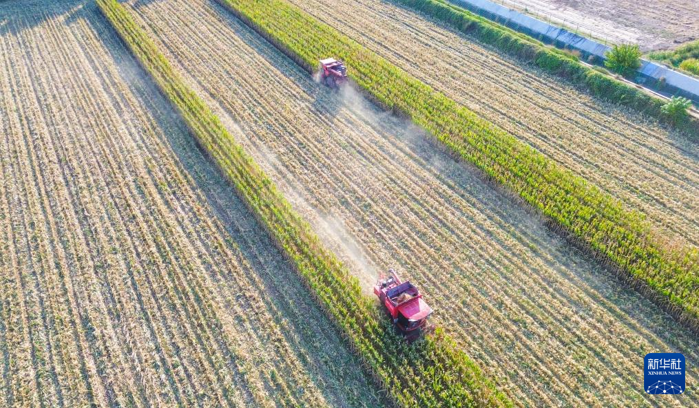 11月1日,农民在位于黄河岸边的河南省洛阳市孟津区白鹤镇田间收获成熟的玉米(无人机照片)。 深秋时节,各地农民抢抓农时加紧收获,处处是喜人的秋日好“丰”景。 新华社发(黄政伟摄)