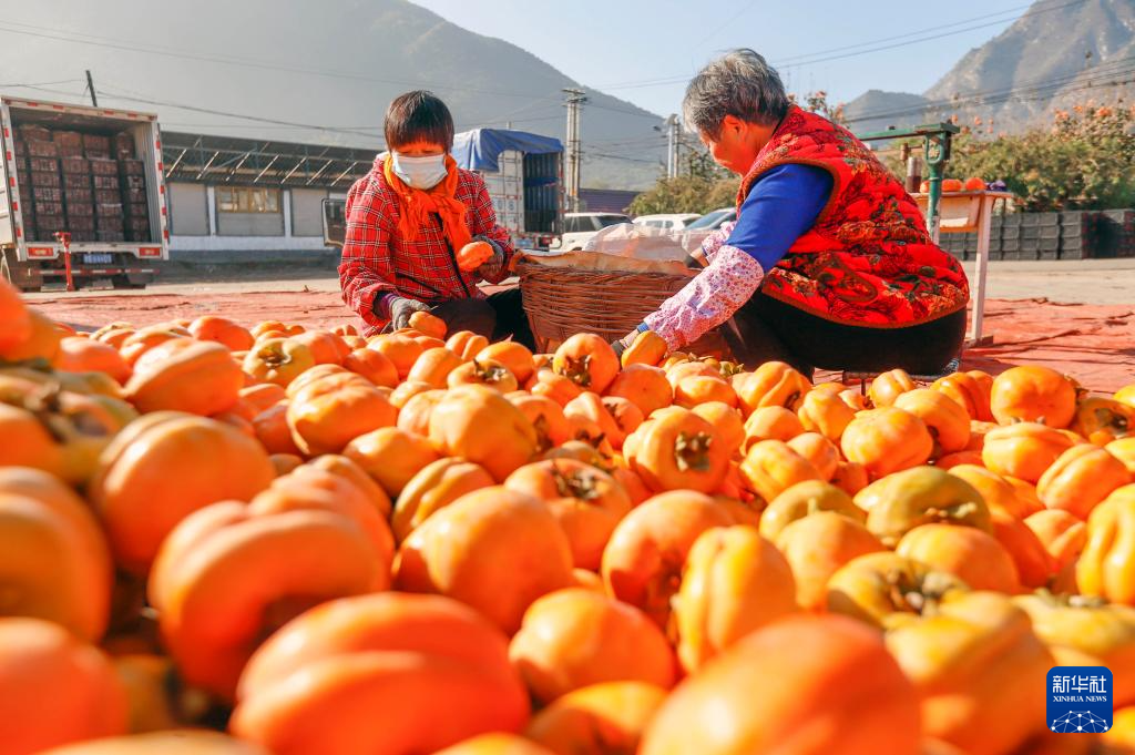 11月1日,河北省遵化市娘娘庄镇芦各寨西山村农民在场院挑选柿子。 深秋时节,各地农民抢抓农时加紧收获,处处是喜人的秋日好“丰”景。 新华社发(刘满仓摄)