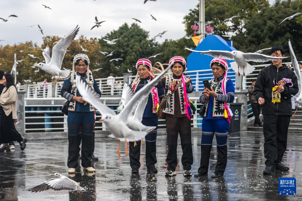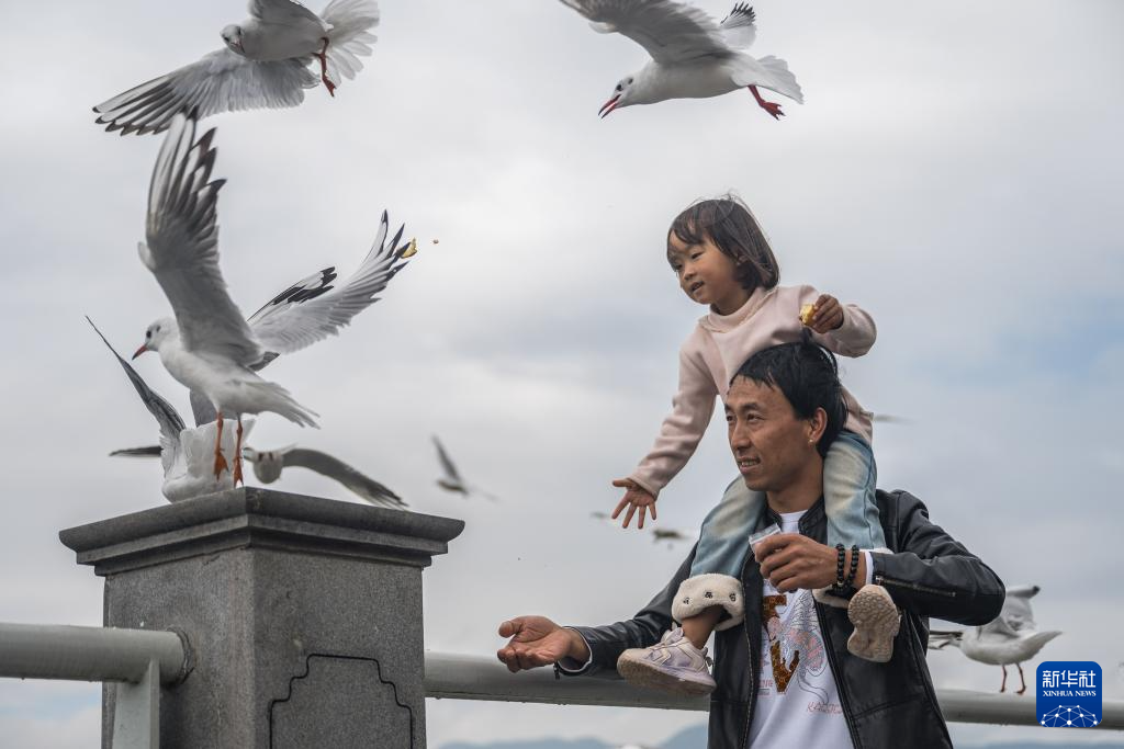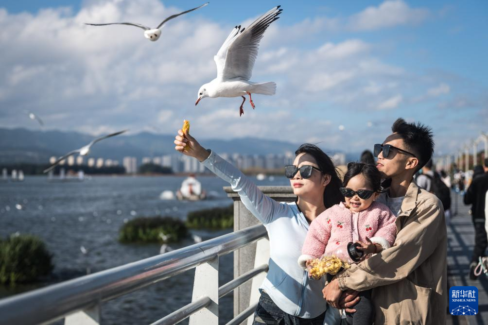 11月10日,游客在云南省昆明市海埂大坝投喂红嘴鸥。 初冬昆明,红嘴鸥如约而至,跨越四十载人鸥和谐的画面在“春城”上演。 新华社记者 王冠森 摄